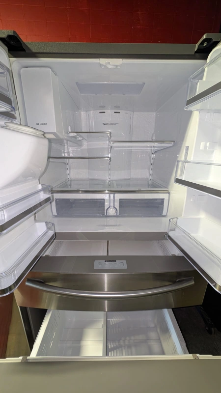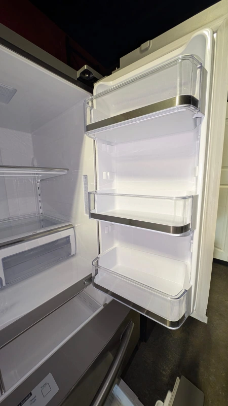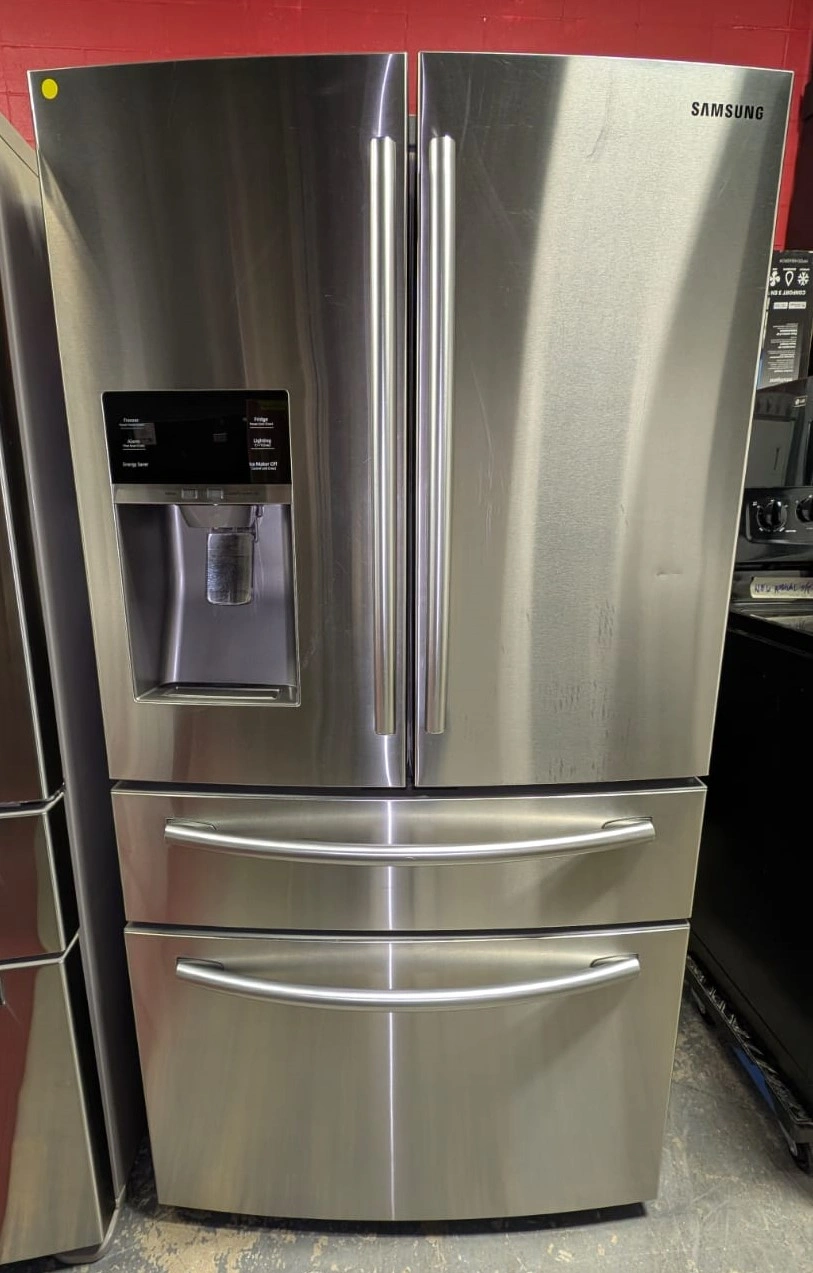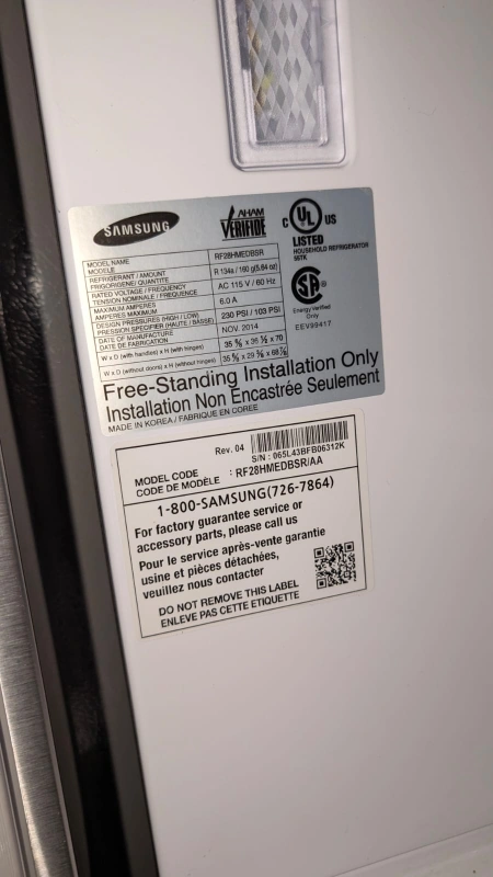 Selling a Samsung French Door Refrigerator, model RF28HMEDBSR. It's a free-standing installation unit, made in Korea. The dimensions are approximately 35 3/4" x 29 3/4" x 70".