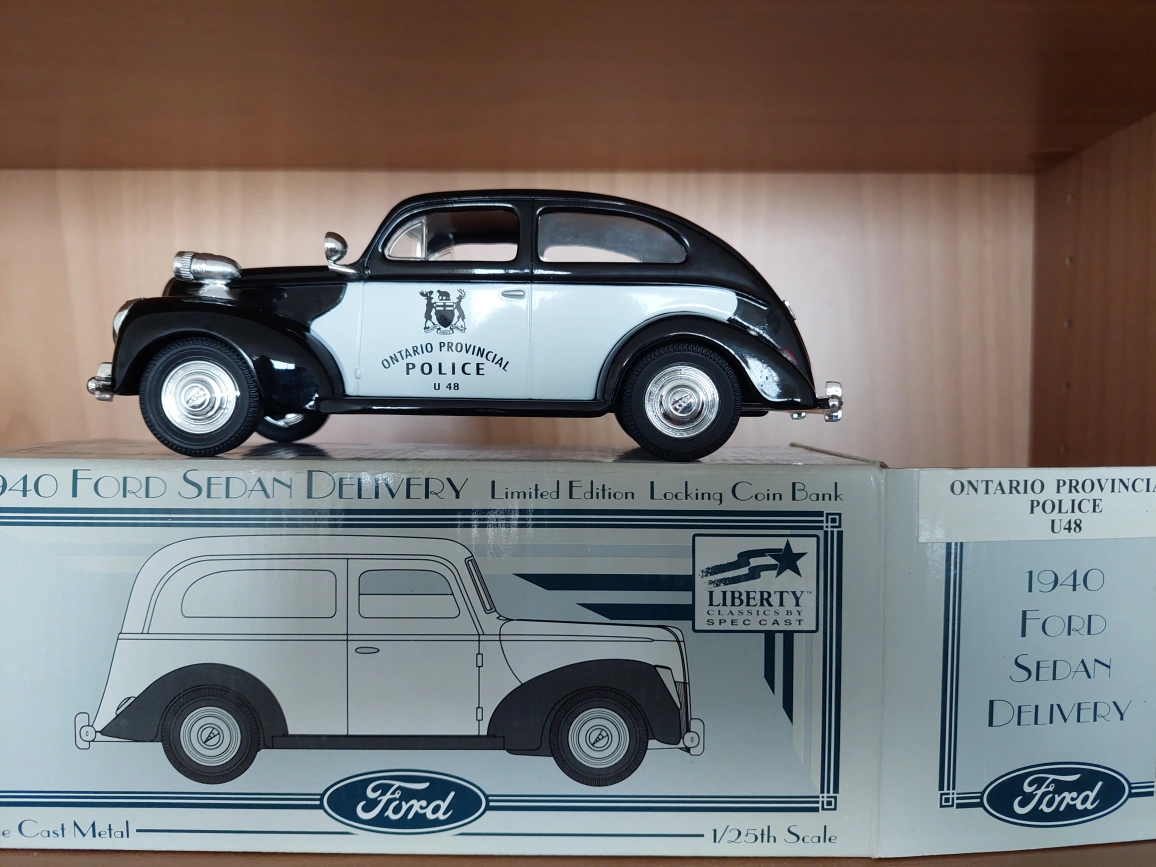Selling a 1940 Ford Sedan Delivery diecast featuring the Ontario Provincial Police livery. It's a limited edition piece from Liberty Classics by Spec Cast, scaled at 1/25th. The box is included!