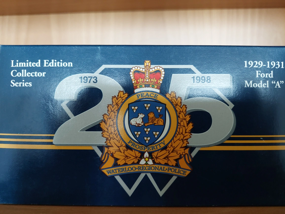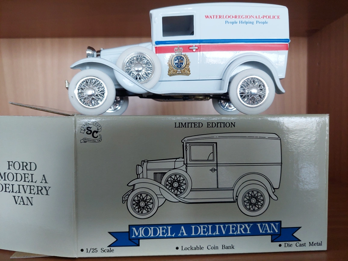 Selling a limited edition Ford Model A Delivery Van, a die-cast metal collectible! It's a 1/25 scale replica of a Waterloo Regional Police vehicle. This model also functions as a lockable coin bank. Comes with its original box!