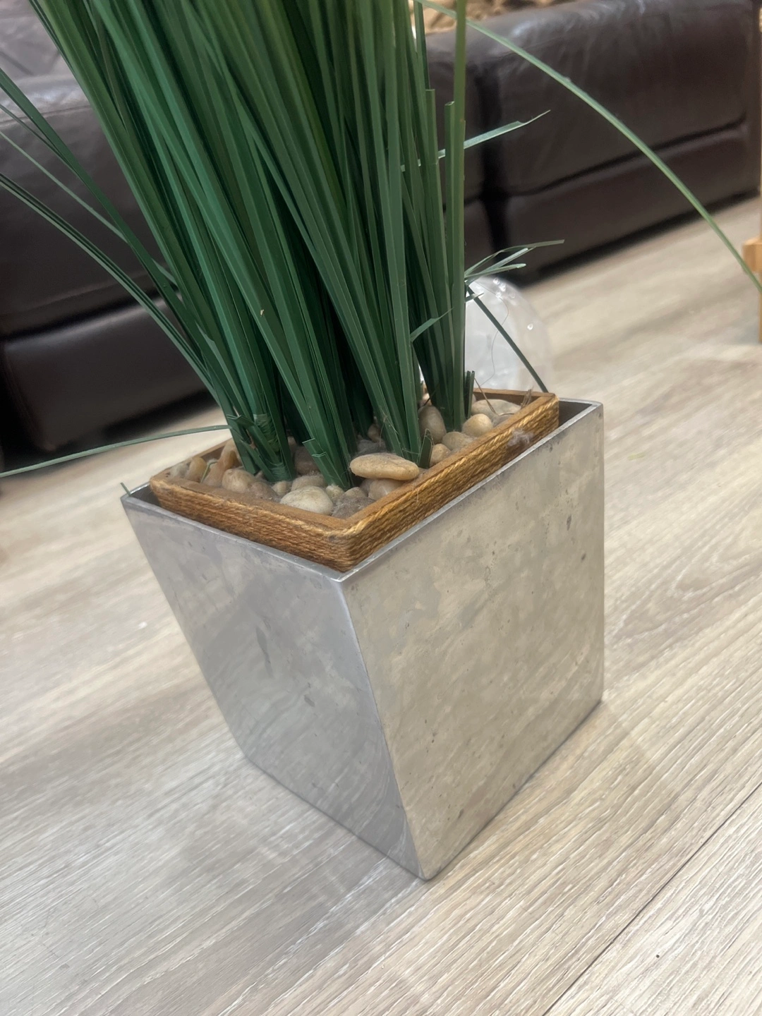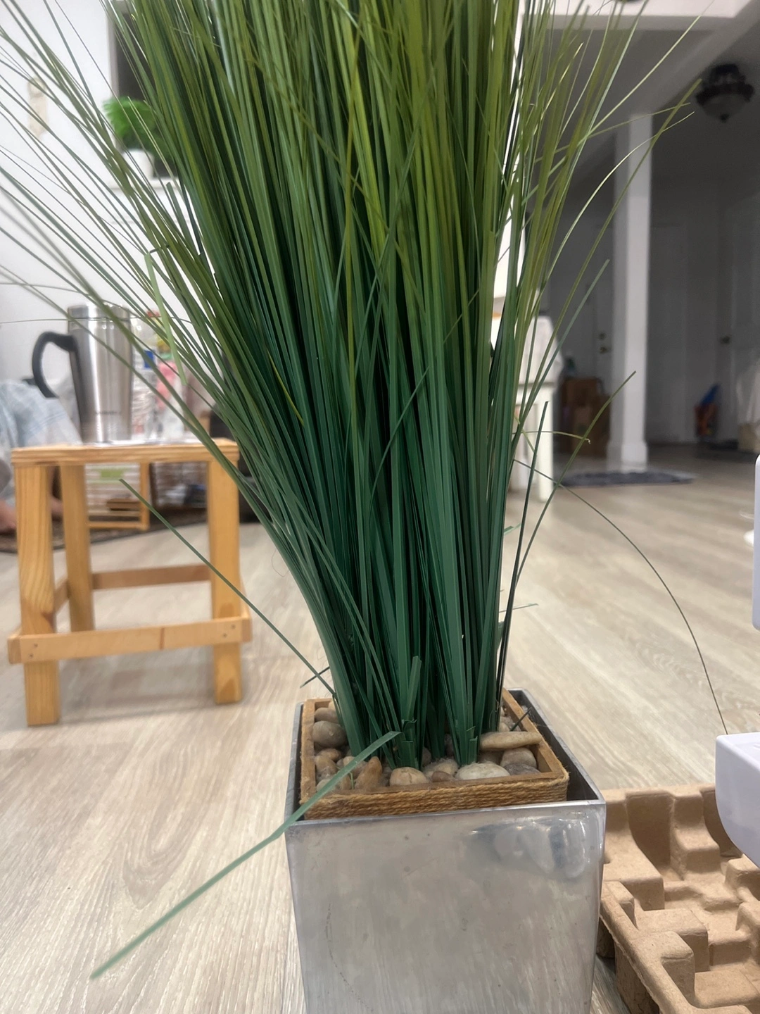 Selling a faux grass plant in a modern silver square pot. It's perfect for adding a touch of greenery to any room without the hassle of maintenance. The pot has a clean, minimalist design that complements the natural look of the grass. Great for home decor!