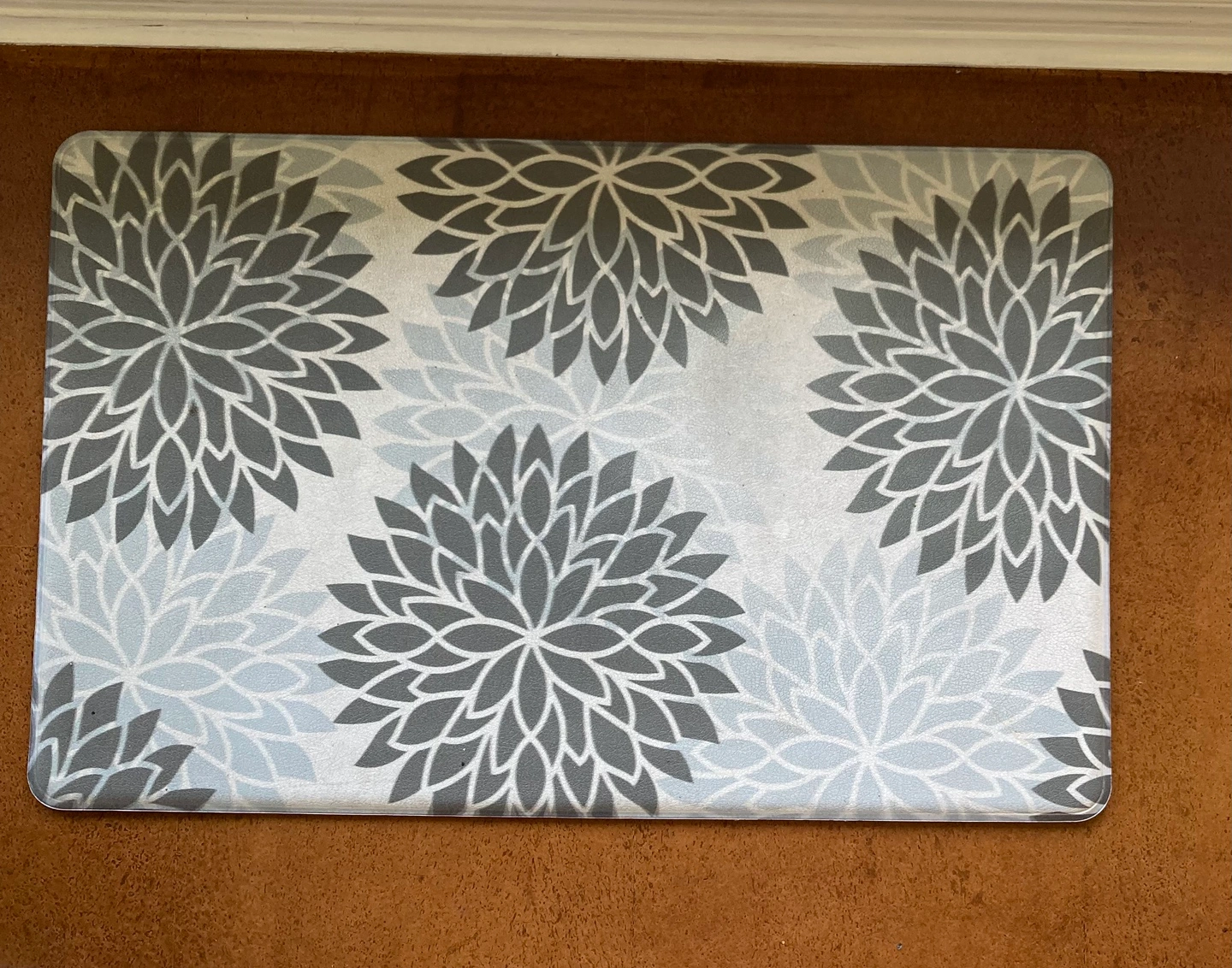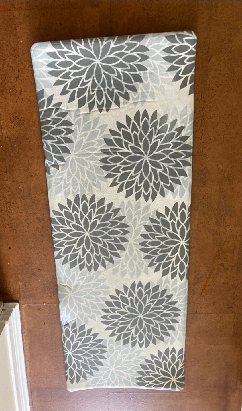 One runner 17” 47” one small mat 17” 27”lovely floral pattern in gray and white. Soft 1cm thick padded surfaces waterproof washable non slip bottoms. They're in great condition and would add a nice touch to any kitchen