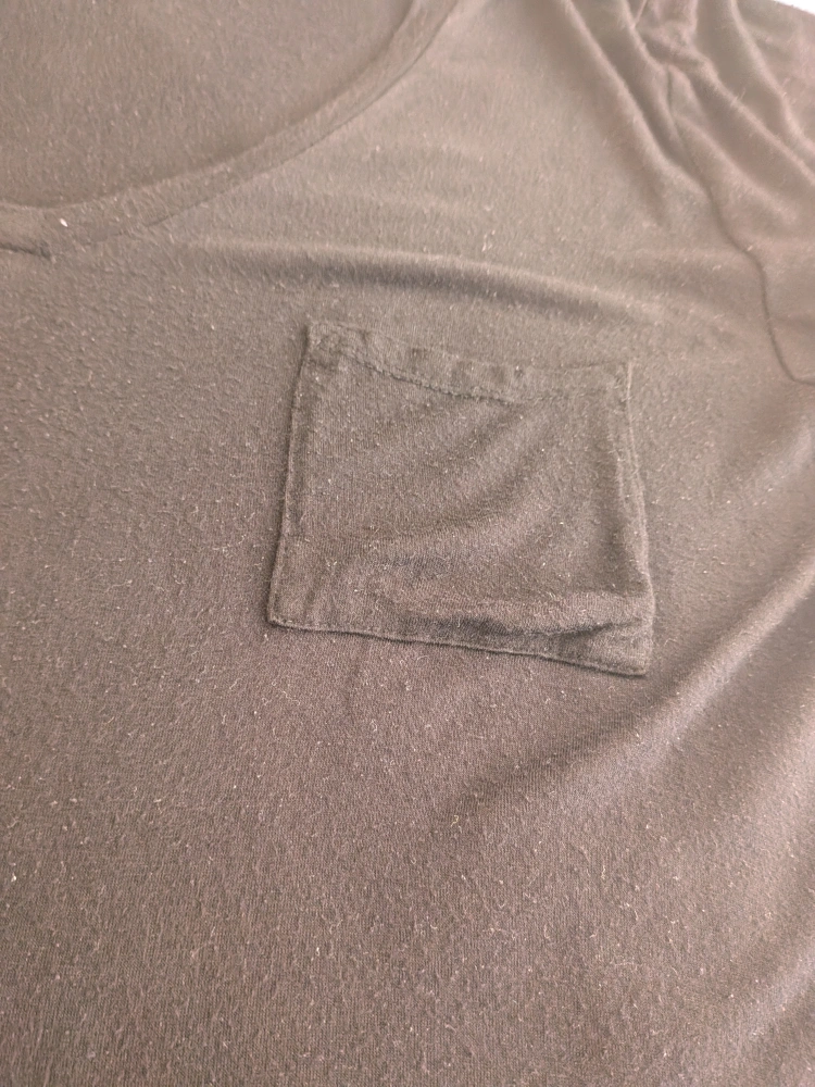 A black V-neck T-shirt from SW Essentials! It features a cute little pocket on the front. Perfect for everyday wear! Some pilling on the shirt.