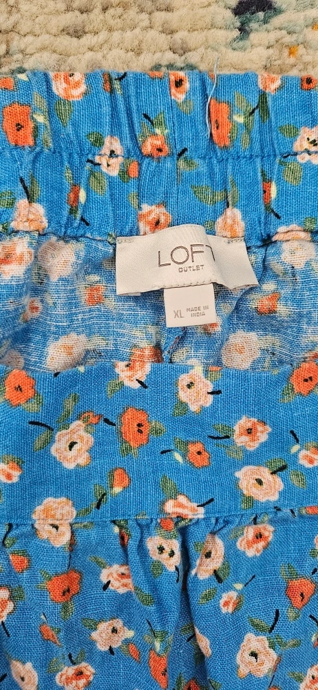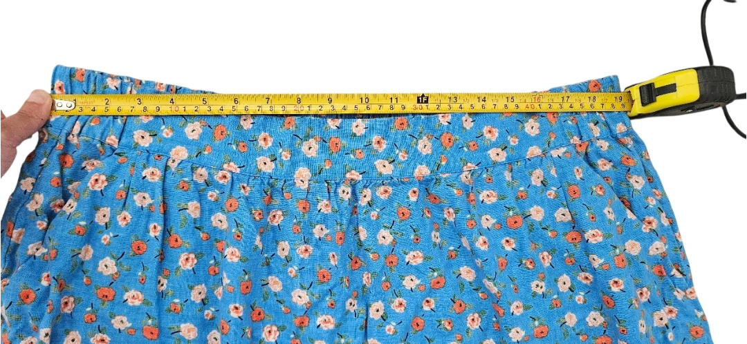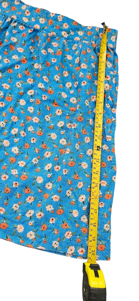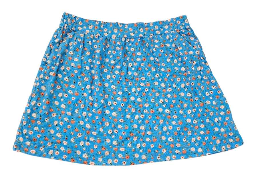 Here's a cute LOFT Outlet skirt in size XL! It's a light blue colour with a floral pattern. The waist measures approximately 18 inches across when laid flat, and the length is about 20 inches