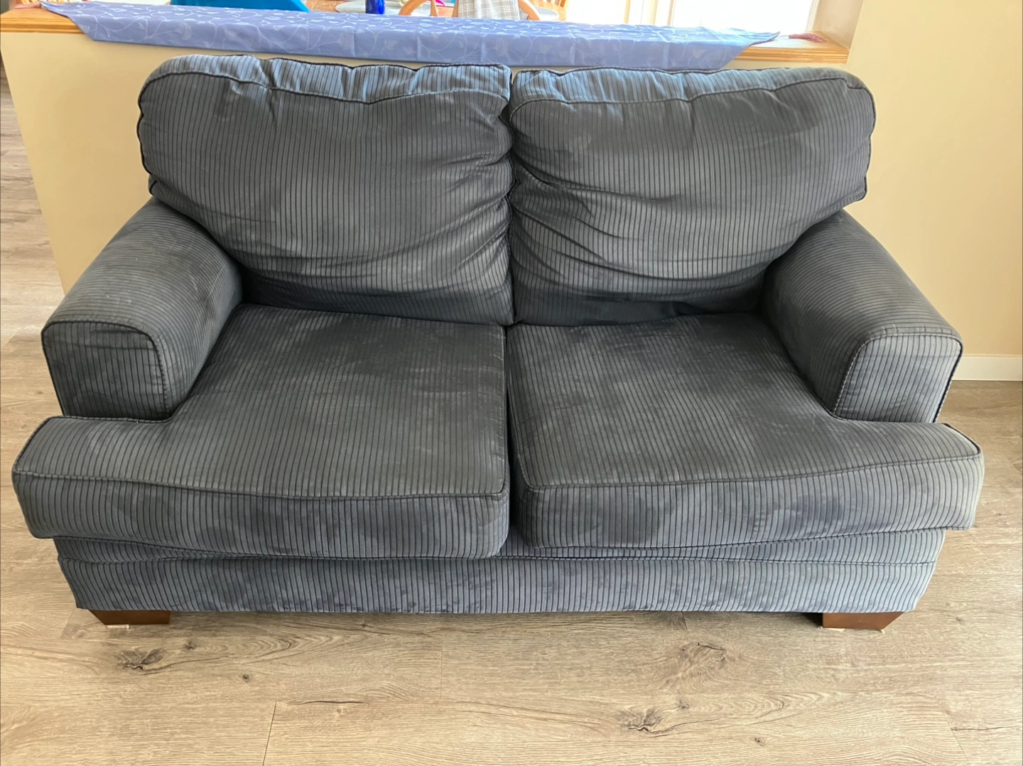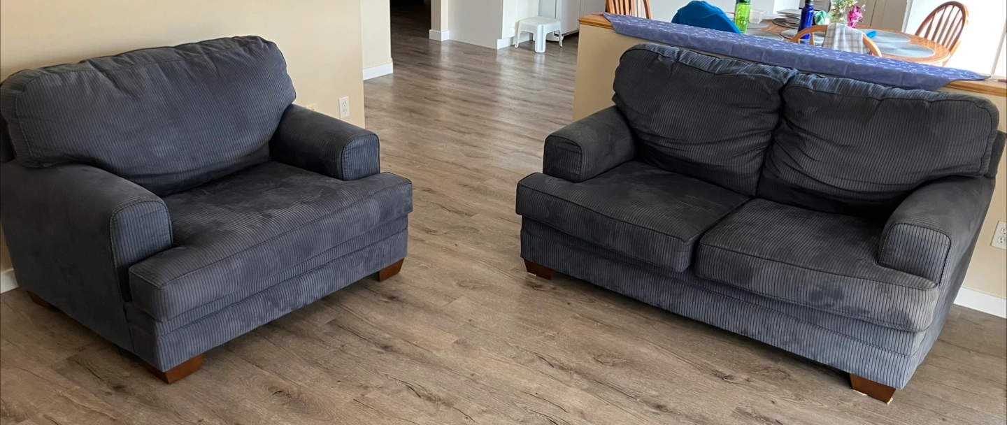 Look at this loveseat and oversized armchair set! They're a nice blue fabric and would be great for a living room or den. They are in very good shape for relaxing and lounging