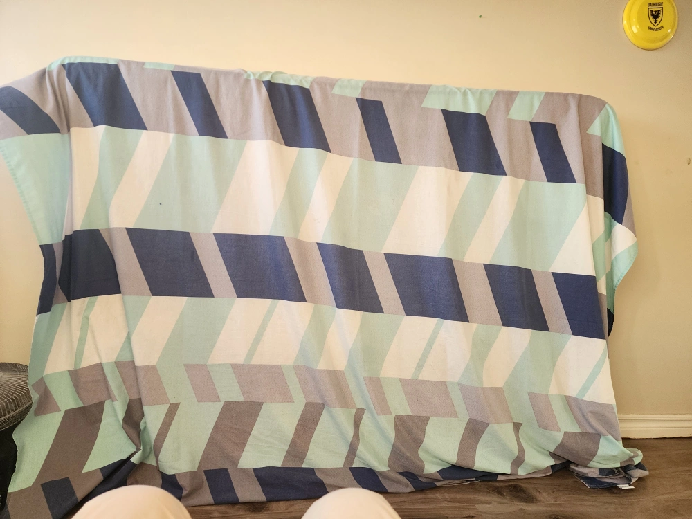 Here's a lovely throw blanket with a geometric pattern. It features stripes in shades of blue, grey, and white. Perfect for adding a touch of style to your living space or keeping cozy on chilly evenings!