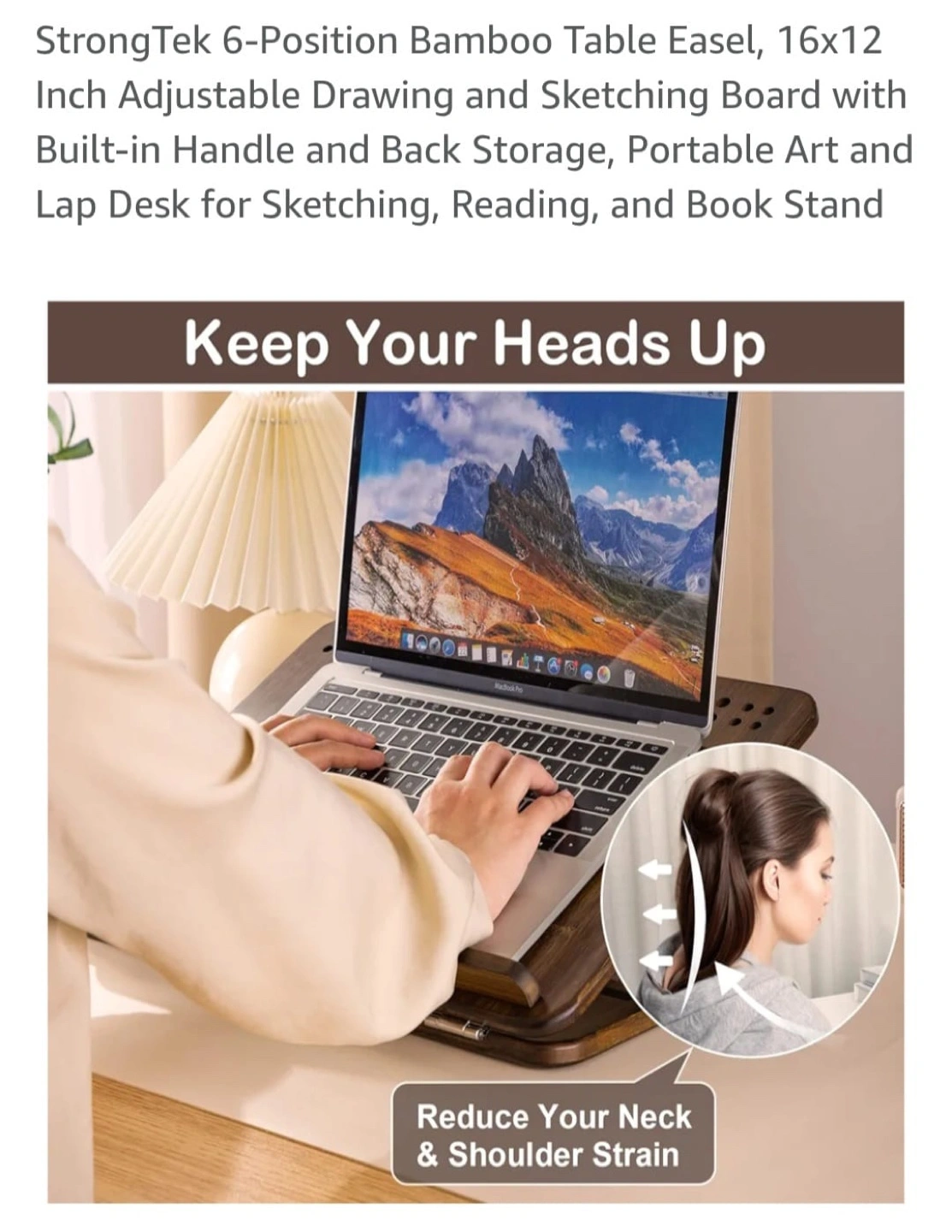 Check out this StrongTek 6-Position Bamboo Table Easel! It's a 16x12 inch adjustable drawing and sketching board. It has built-in handle and back storage, making it a portable art and lap desk for sketching, reading, and even as a book stand. It's perfect for keeping your head up and reducing neck and shoulder strain while you work on your art on-the-goi
