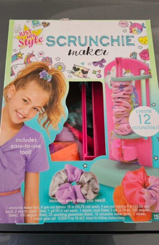 Get ready to create scrunchies with this Just My Style Scrunchie Maker kit! It includes everything you need to make your own unique hair accessories. The kit comes with a scrunchie maker tool, pre-cut fabrics, elastic cords, sequins, sparkling gemstones, scrunchie maker locks, a sticker, and fabric glue. Plus, it has easy-to-follow instructions to guide you through the process. used but still have more than half the scrunchies to make.