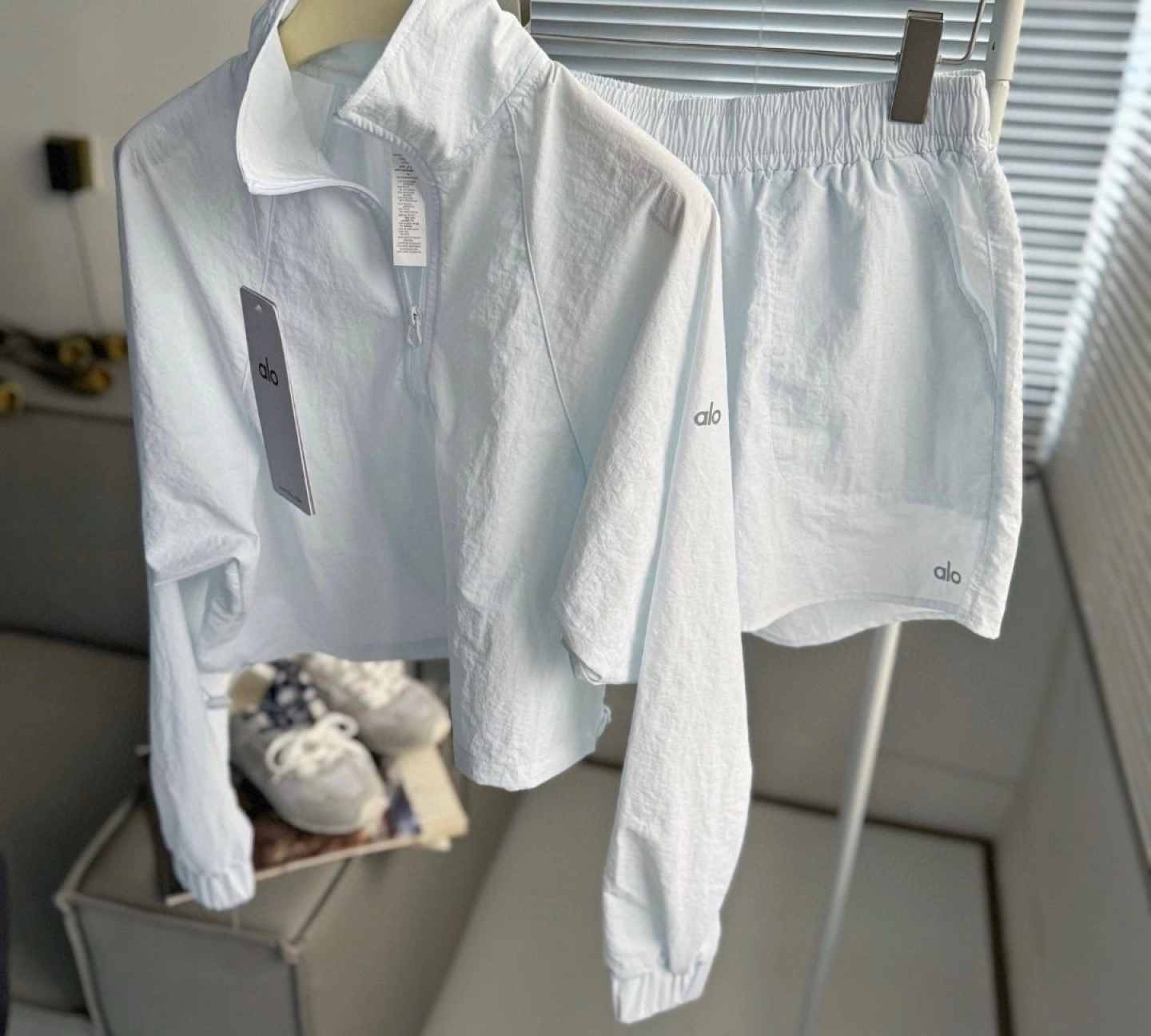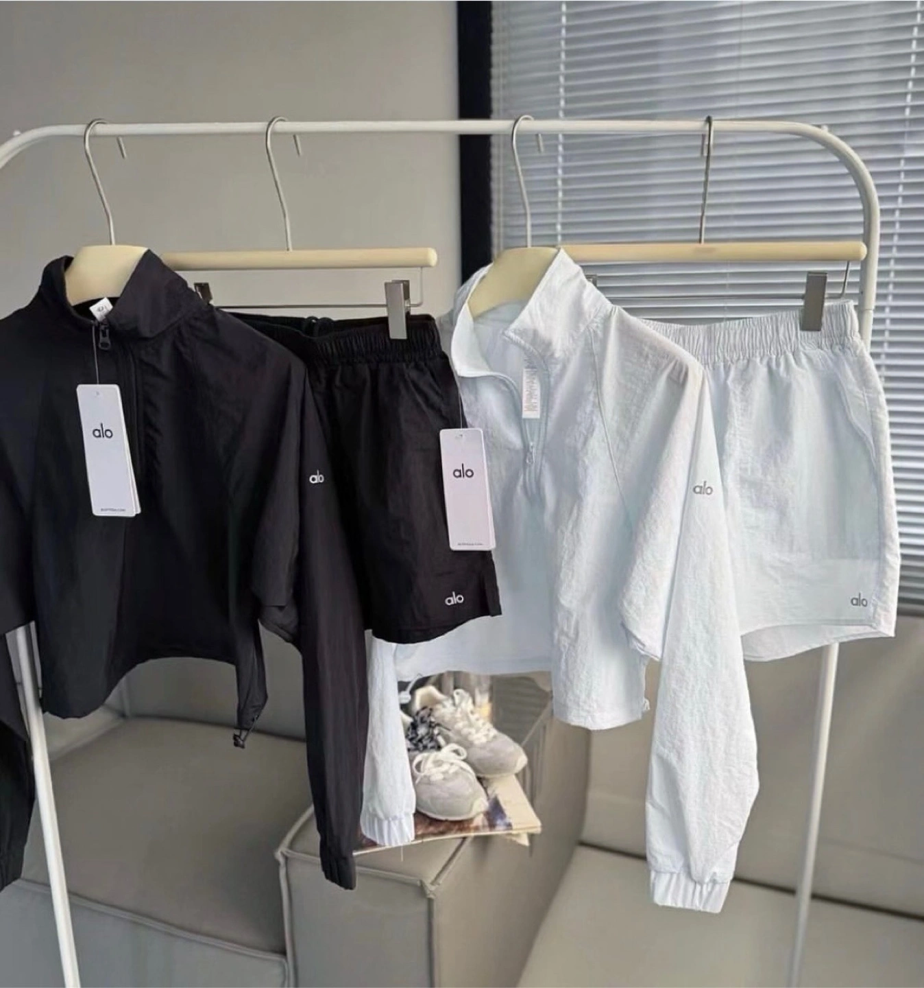 Selling an ALO Yoga Alumni Set, includes a jacket and matching shorts! The jacket features a quarter-zip design, and the shorts have a comfortable elastic waistband. Perfect for workouts or casual wear.