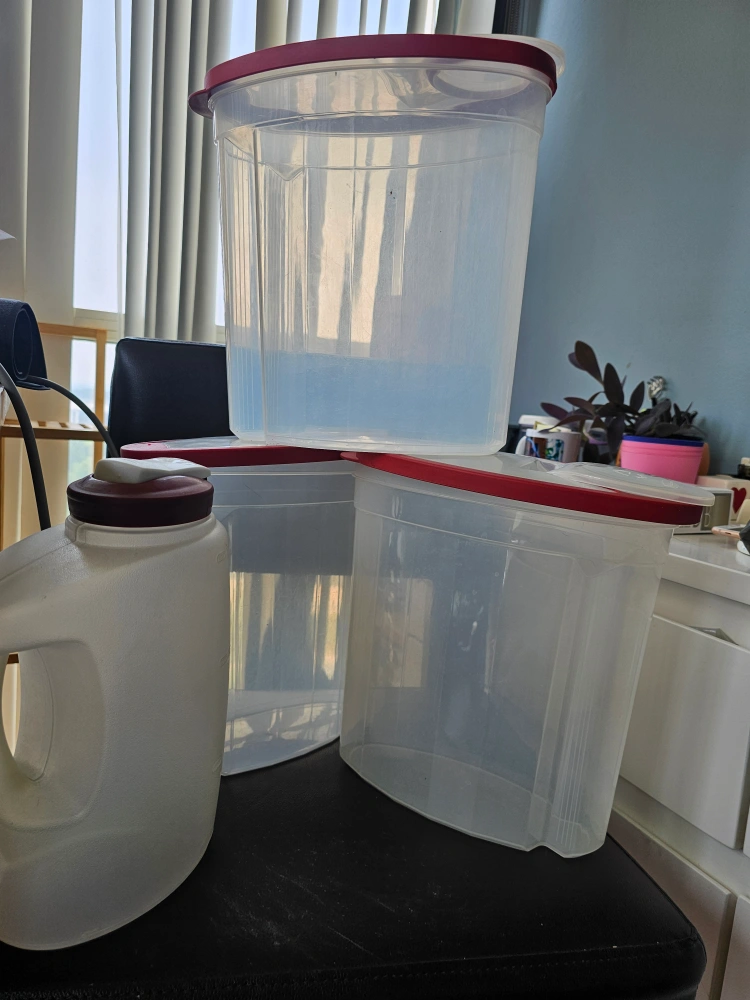 Selling a set of Rubbermaid Oval containers including Juice Jug! They're in great shape and perfect for keeping your pantry organized. The lids are a nice red colour! Great for cereal!