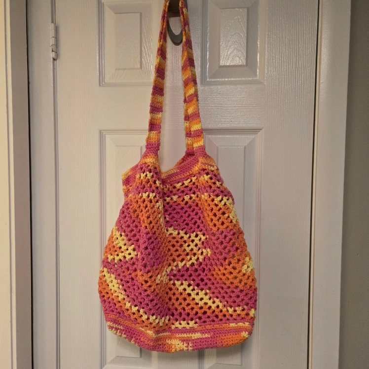 Check out this colourful, handmade crochet tote bag! It's perfect for carrying groceries, books, or anything else you need on the go. The open weave design is both stylish and practical, and the bright colours will add a pop of fun to any outfit