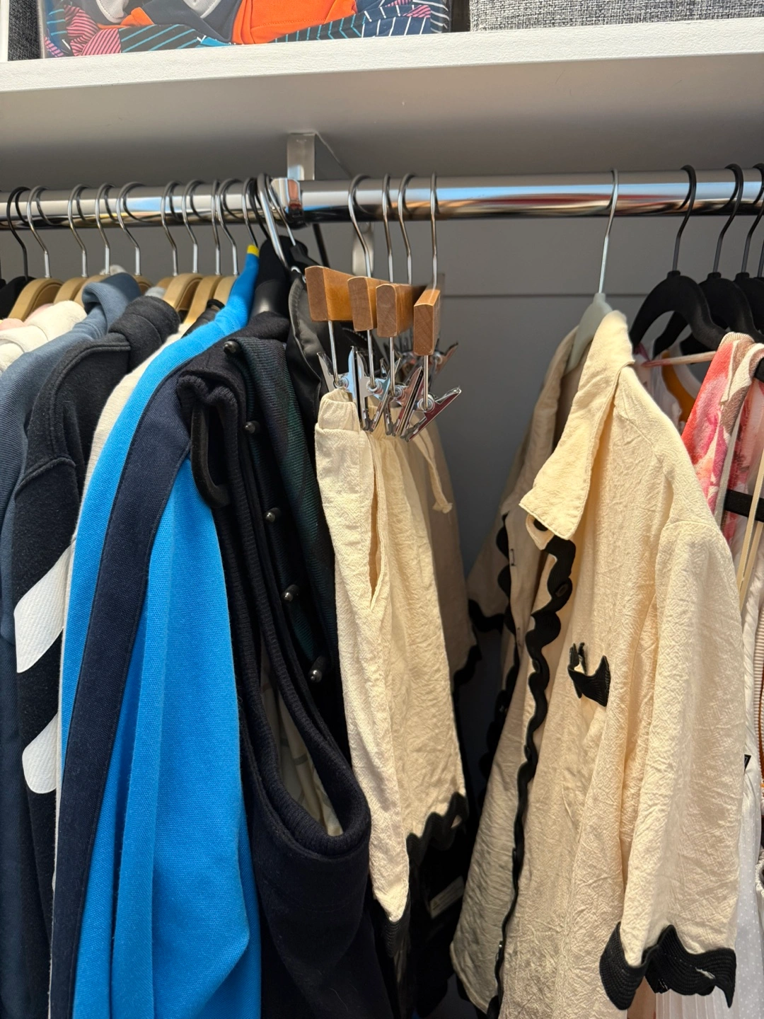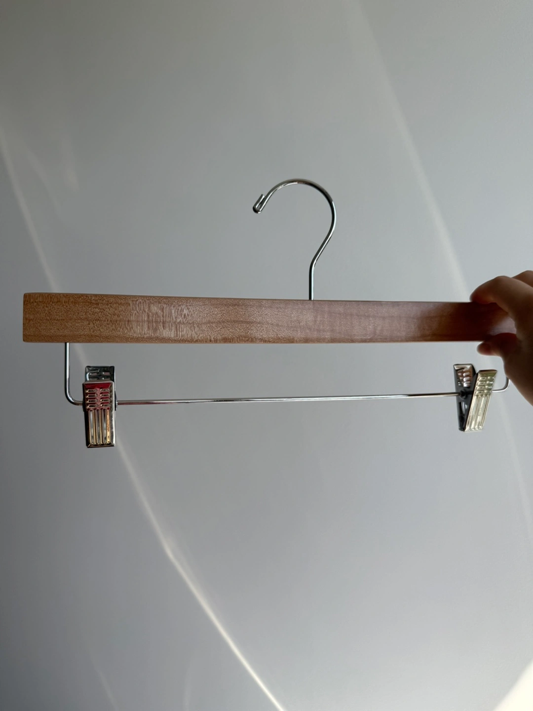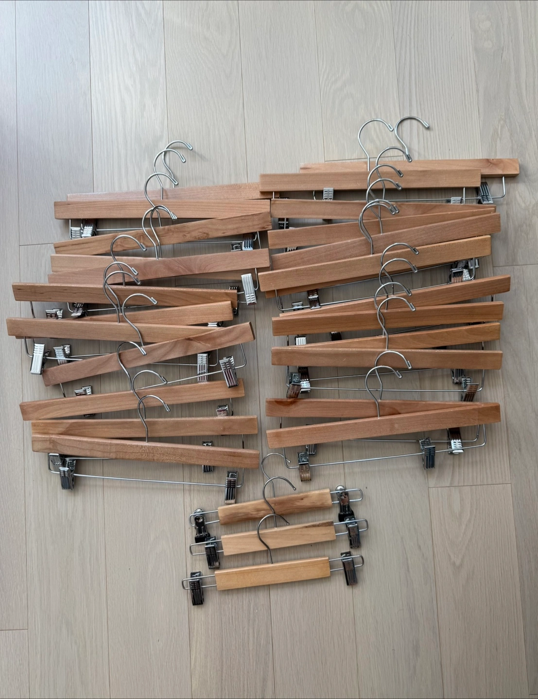 Selling a bundle of 28 high-quality natural wooden hangers with strong metal clips โ ideal for pants, skirts, shorts, or even accessories.