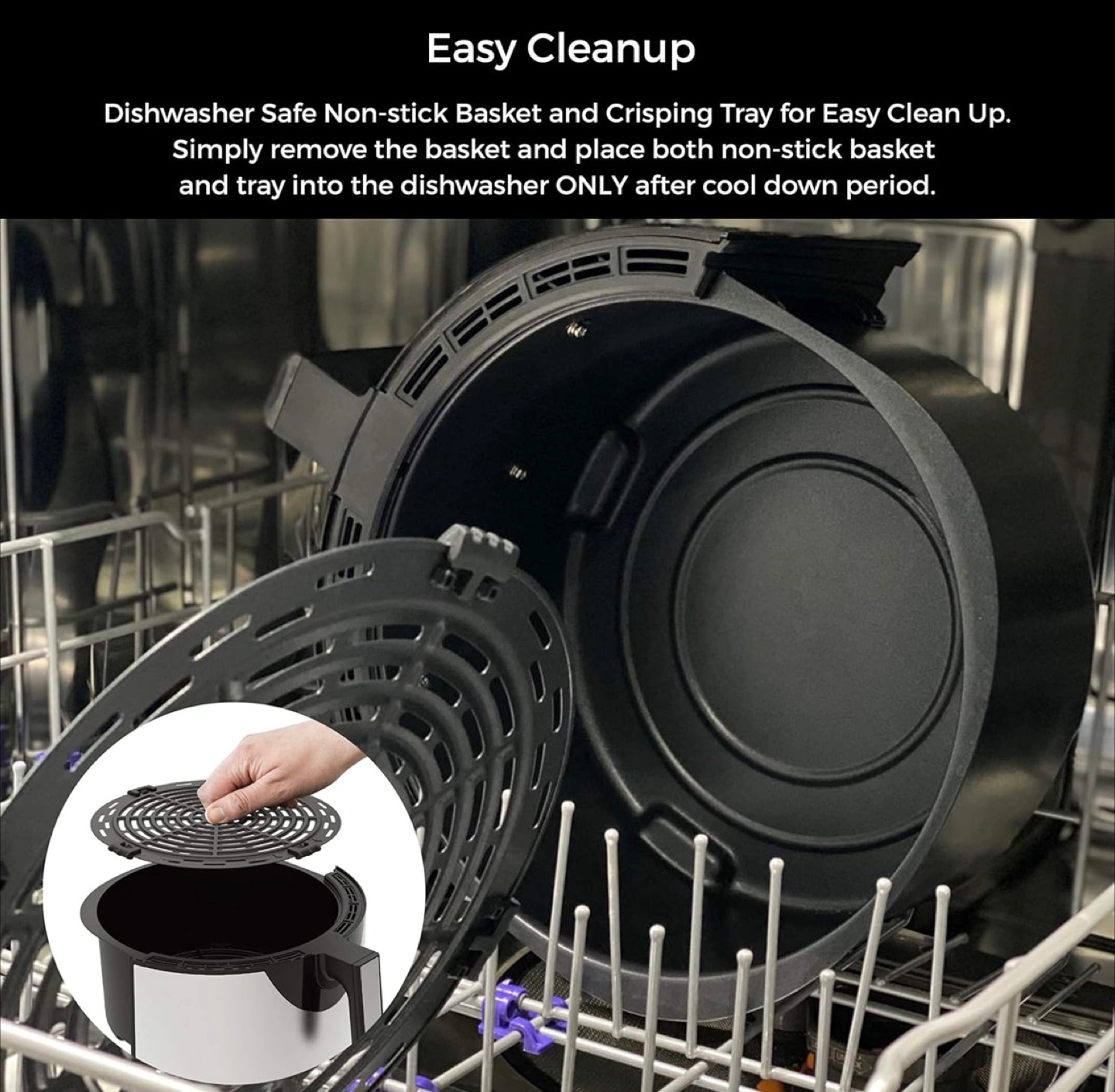 - Dishwasher Safe Non-stick Basket and Crisping Tray for Easy Clean Up