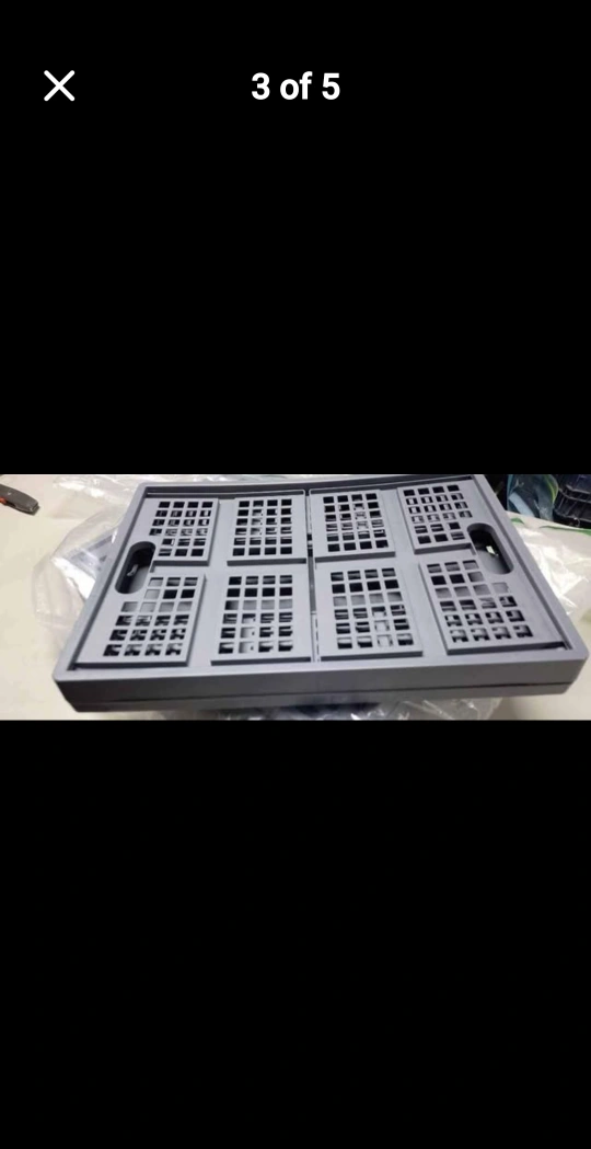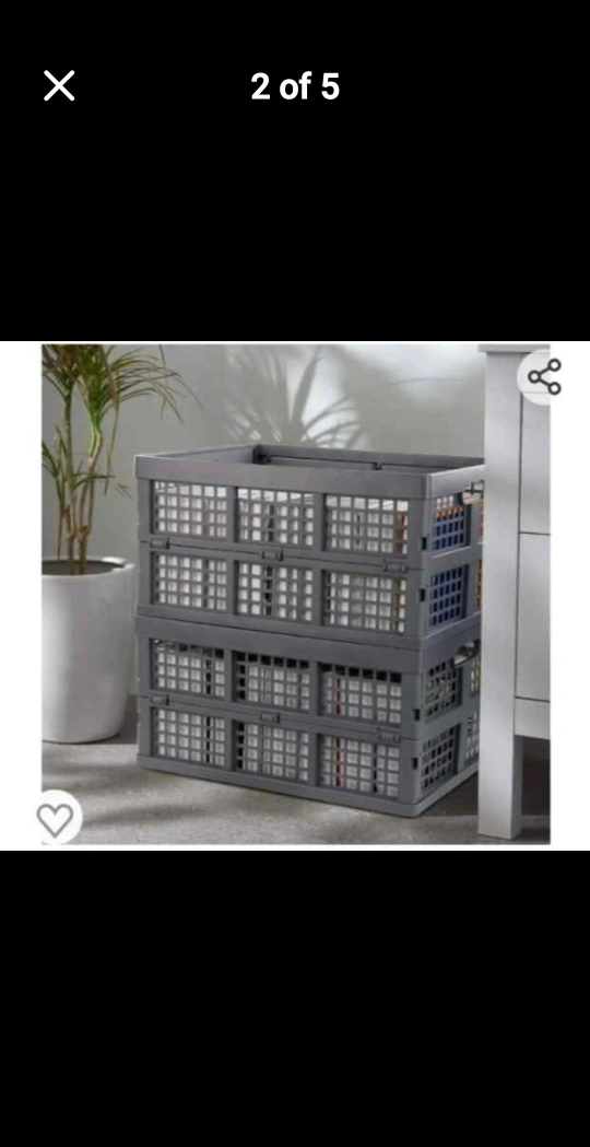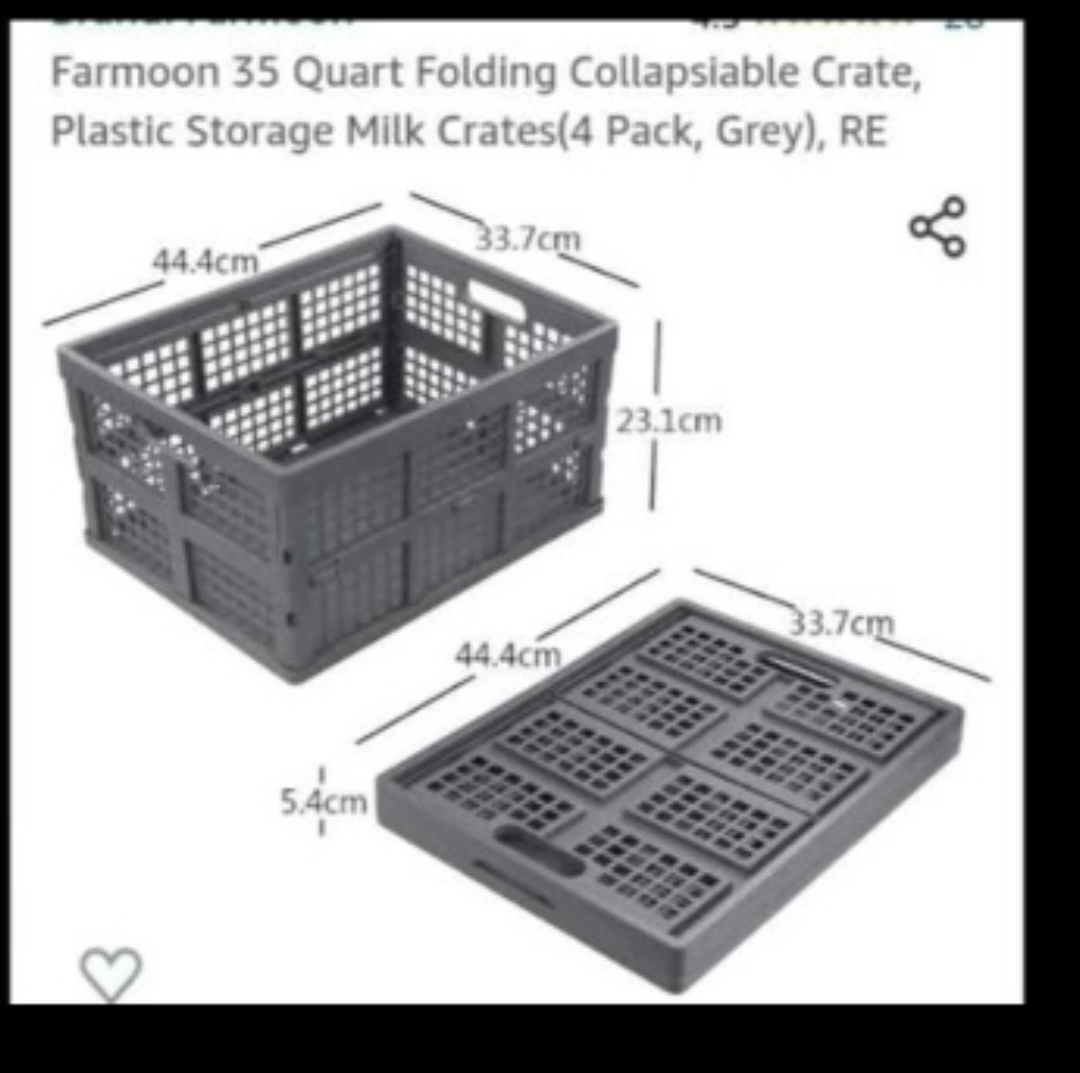 Selling a grey Farmon 35 Quart Folding Collapsible Crate. This plastic storage milk crate is perfect for organizing your space. Dimensions are 44.4cm x 33.7cm x 23.1cm when open, and 5.4cm when folded 2pk