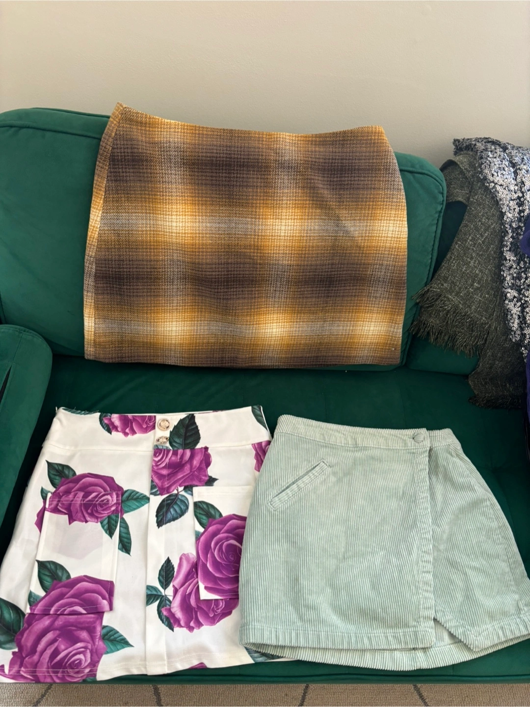 Selling a few skirts that I no longer wear. There's a cute floral skirt, a plaid skirt, and a light green corduroy skirt. All in good condition!