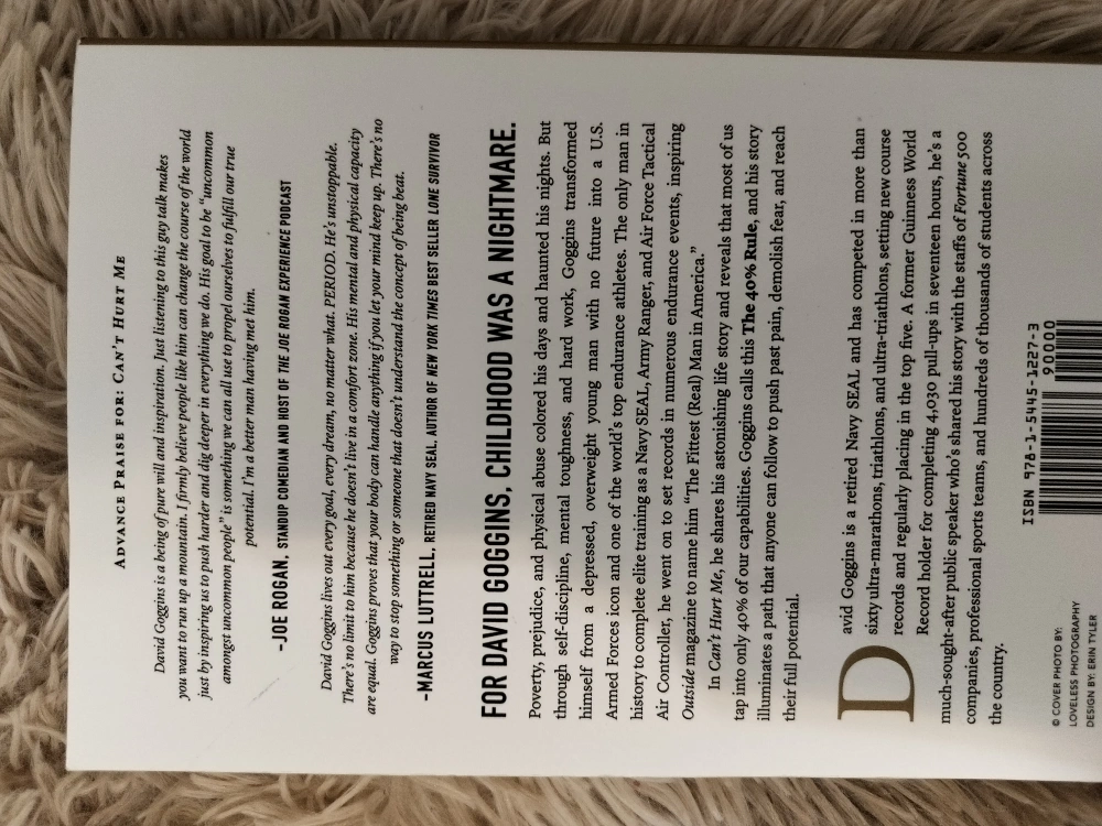Selling a copy of "Can't Hurt Me" by David Goggins. This book is a New York Times bestseller and shares Goggins' story of overcoming adversity and pushing beyond limits. A great read for anyone looking for motivation and inspiration!