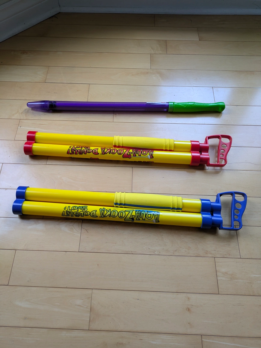 Selling two Aqua Zooka Double Shot water guns. One is yellow with red accents, and the other is yellow with blue accents. Also included is a purple water gun.