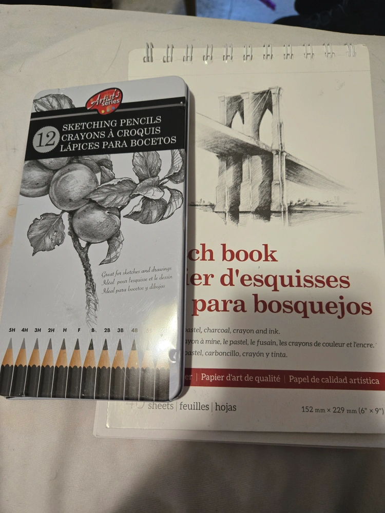 Selling a set of Artist's Series sketching pencils (12 crayons à croquis) and a sketchbook. The pencils are great for sketches and drawings. The sketchbook is 152 mm x 229 mm (6" x 9") and contains 40 sheets.