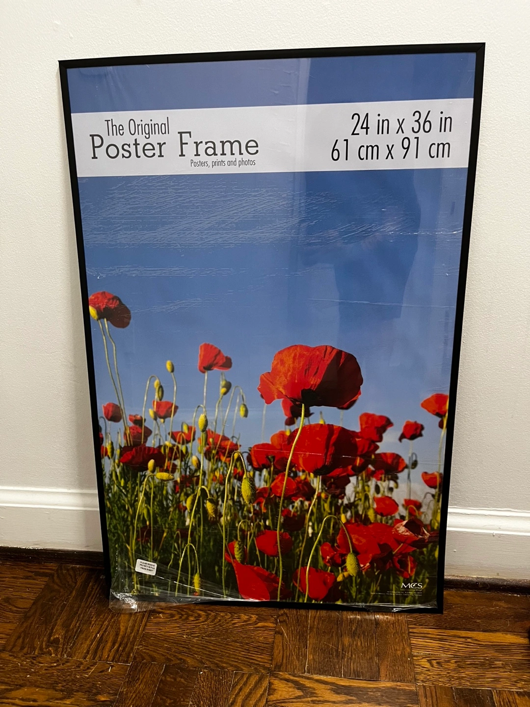 Selling an MCS The Original Poster Frame. It's sized at 24 inches by 36 inches (61 cm x 91 cm). Comes with lightweight corrugated backing and attached sawtooth hangers, a plexiglass sheet, and four frame strips