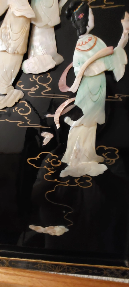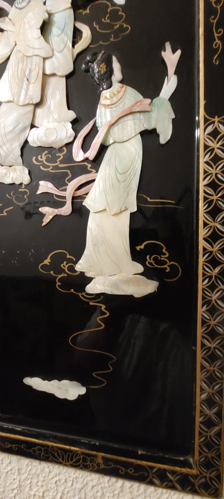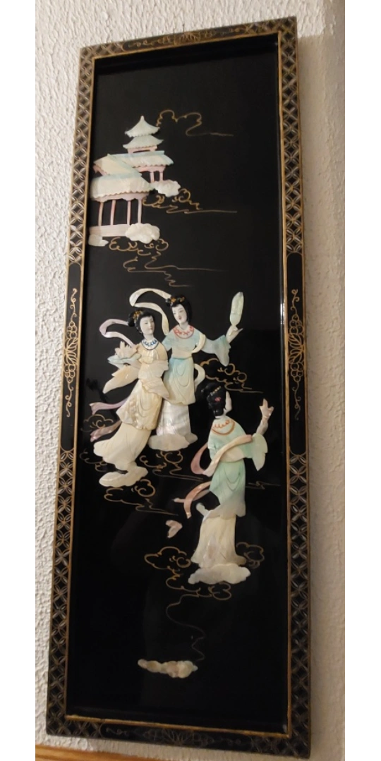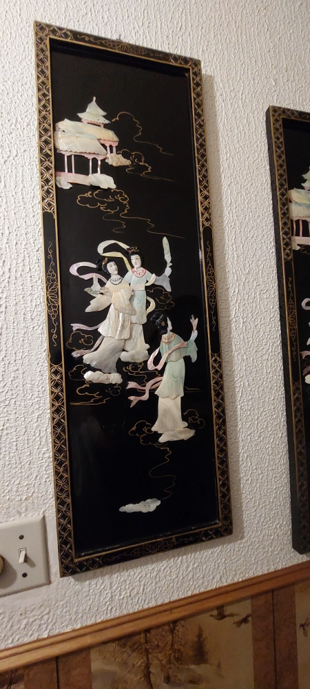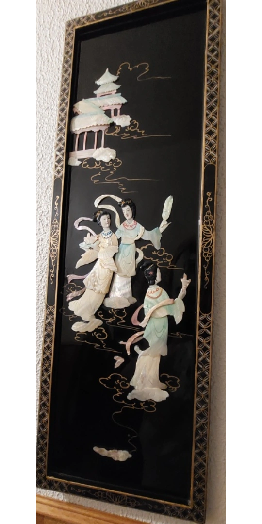 Selling a beautiful vintage Asian-inspired wall art panels. It features mother-of-pearl inlays depicting traditional figures and cloud designs. The panel is framed in a dark wood with gold accents, adding an elegant touch to any room.