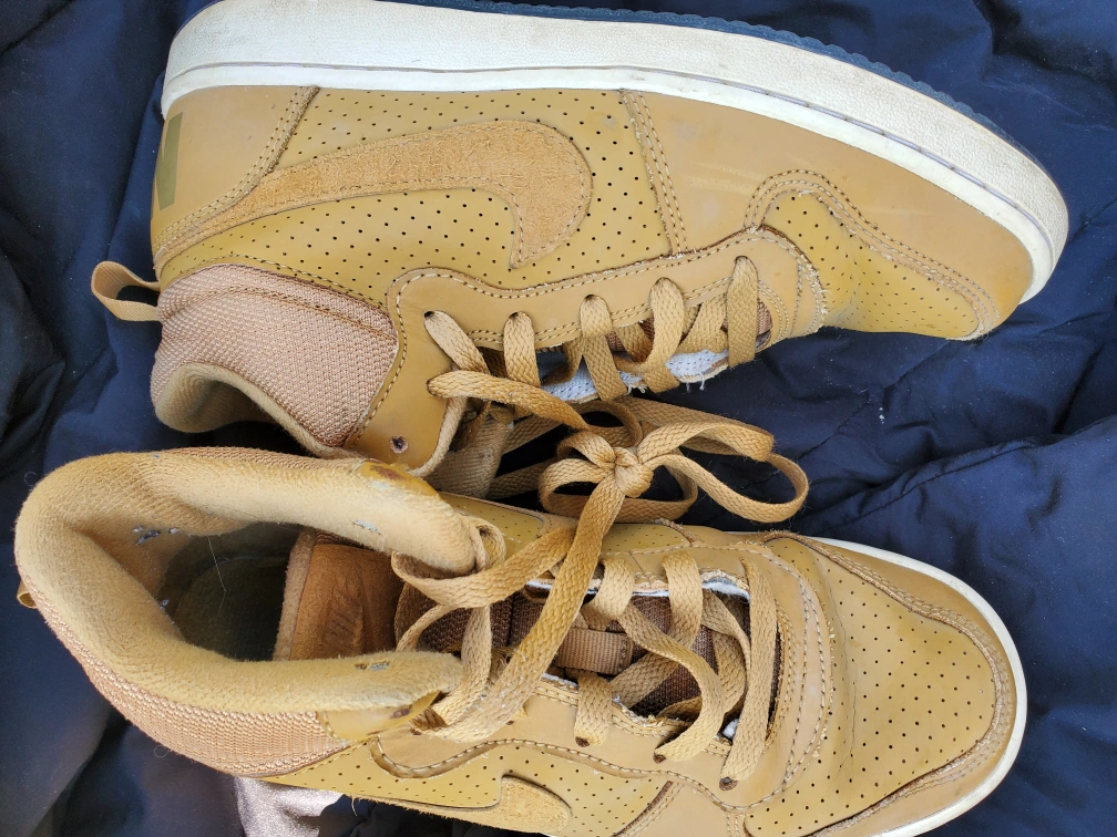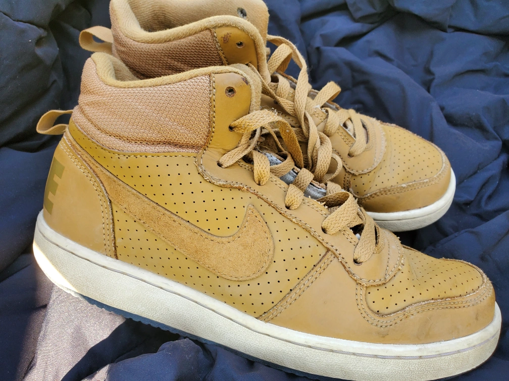 60Selling a pair of Nike Court Borough Mid 2 shoes in a youth size 5.5. They have a classic high-top design and the iconic Nike swoosh. The shoes are a tan colour and have some signs of wear, but still have lots of life left in them!
