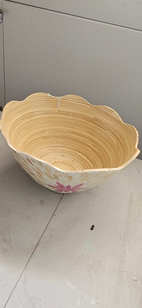Selling a lovely decorative bamboo bowl! It features a unique floral design and would look great as a centrepiece or accent piece in any room