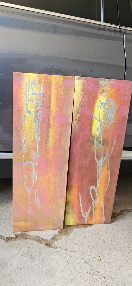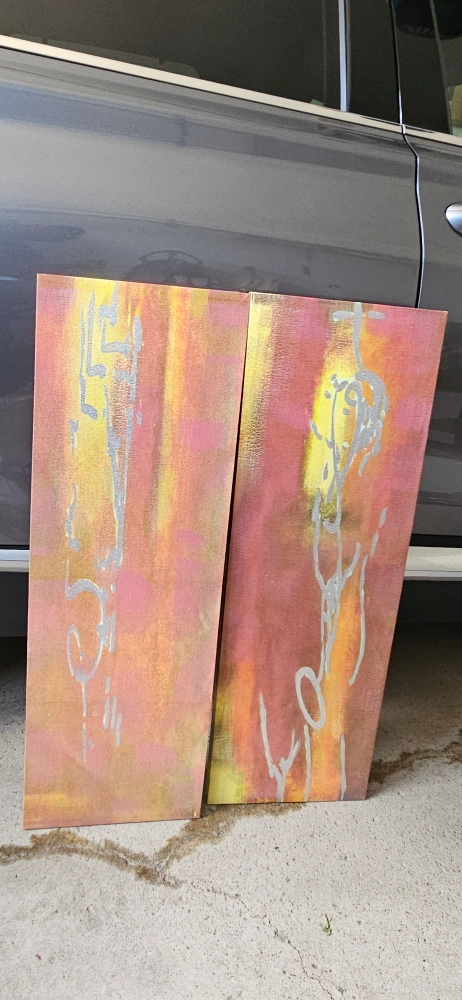 Selling a set of two original abstract art pieces. The canvases feature a blend of yellow, pink, and orange hues with silver accents. These unique pieces would make a great addition to any art lover's collection