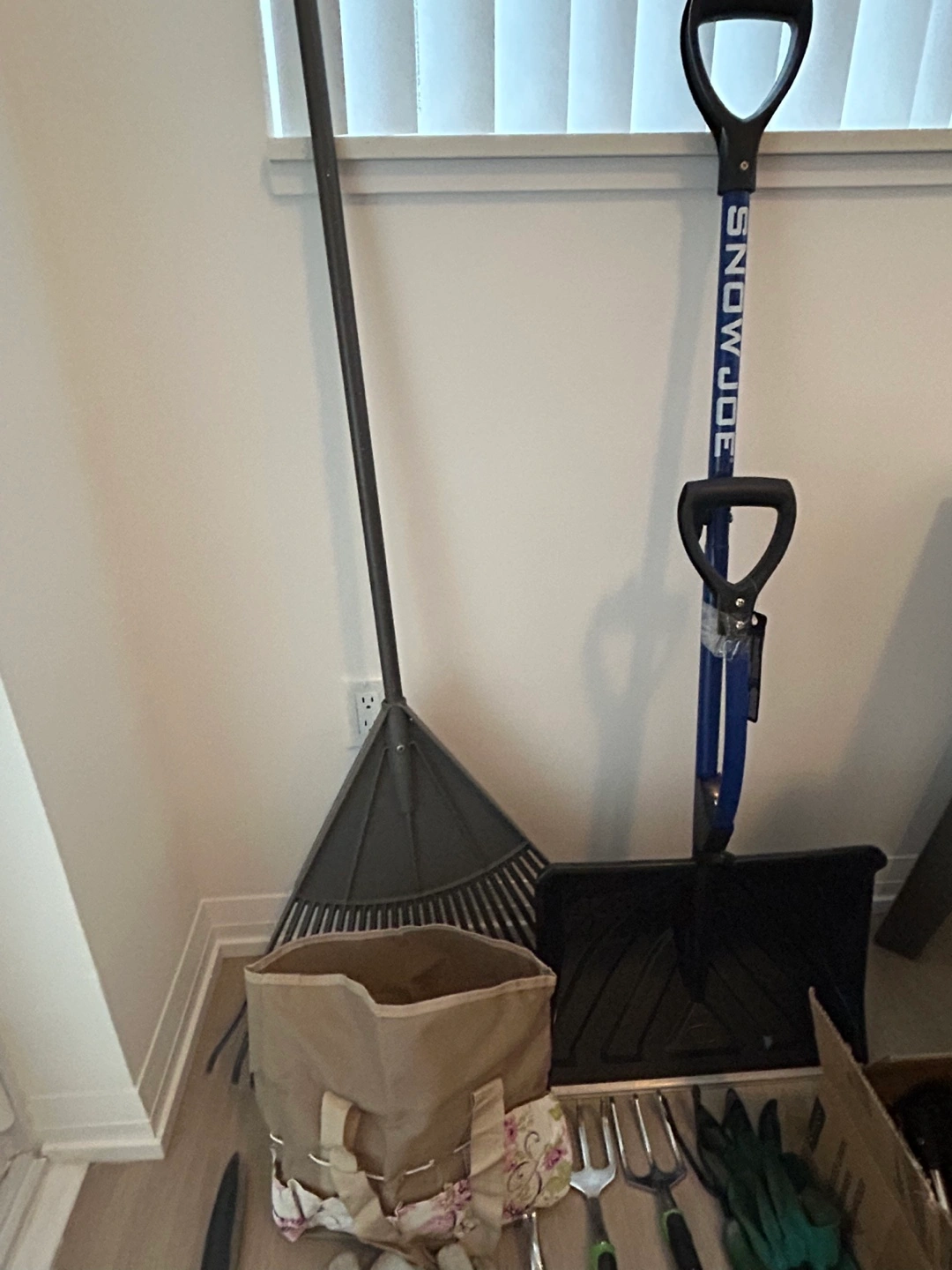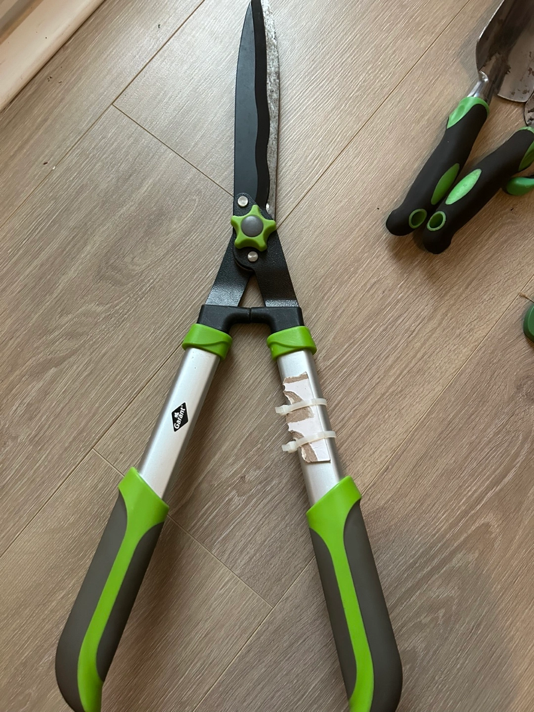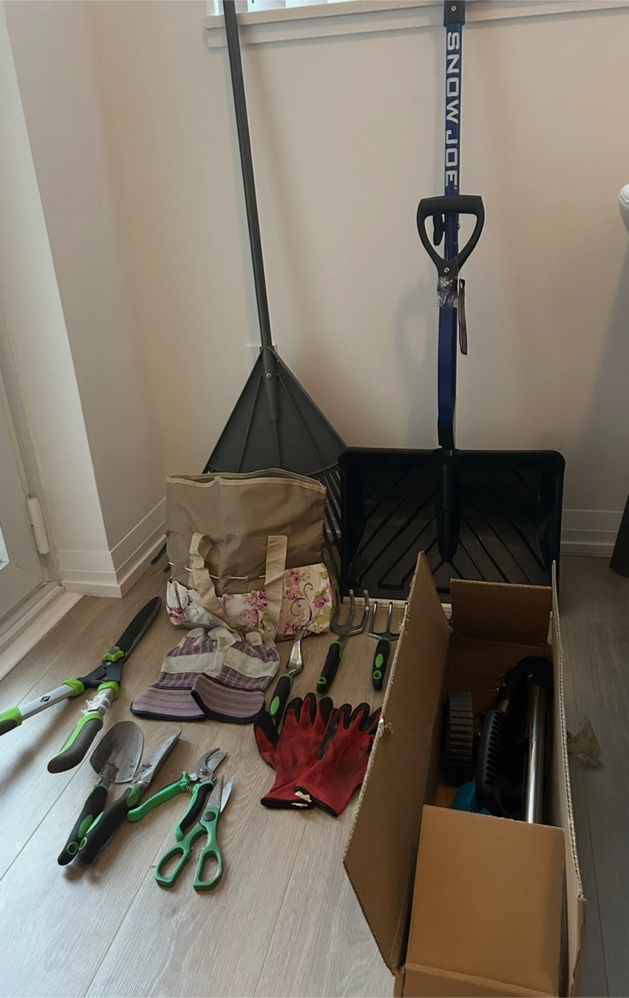Selling a gardening tool set, including a Rainbean cordless trimmer, a Snow Joe shovel, Garant shear, various hand tools, a bag and gloves. Great for preparing your garden for summer or braving winter blizzards.