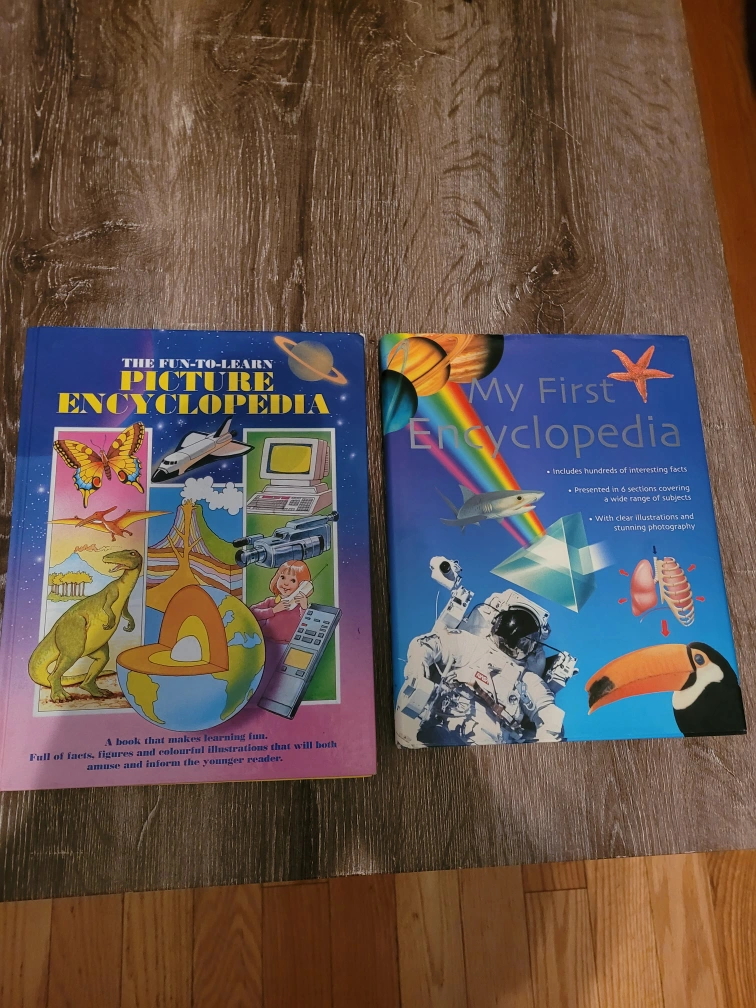 Selling two encyclopedias for kids! One is "The Fun-to-Learn Picture Encyclopedia" and the other is "My First Encyclopedia" These books are full of colourful illustrations and interesting facts to amuse and inform the younger reader