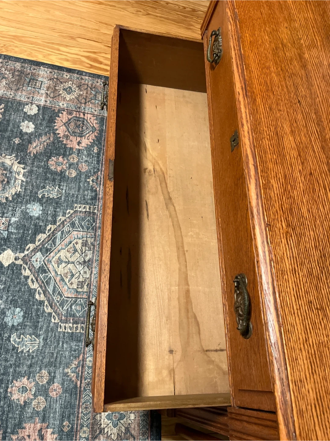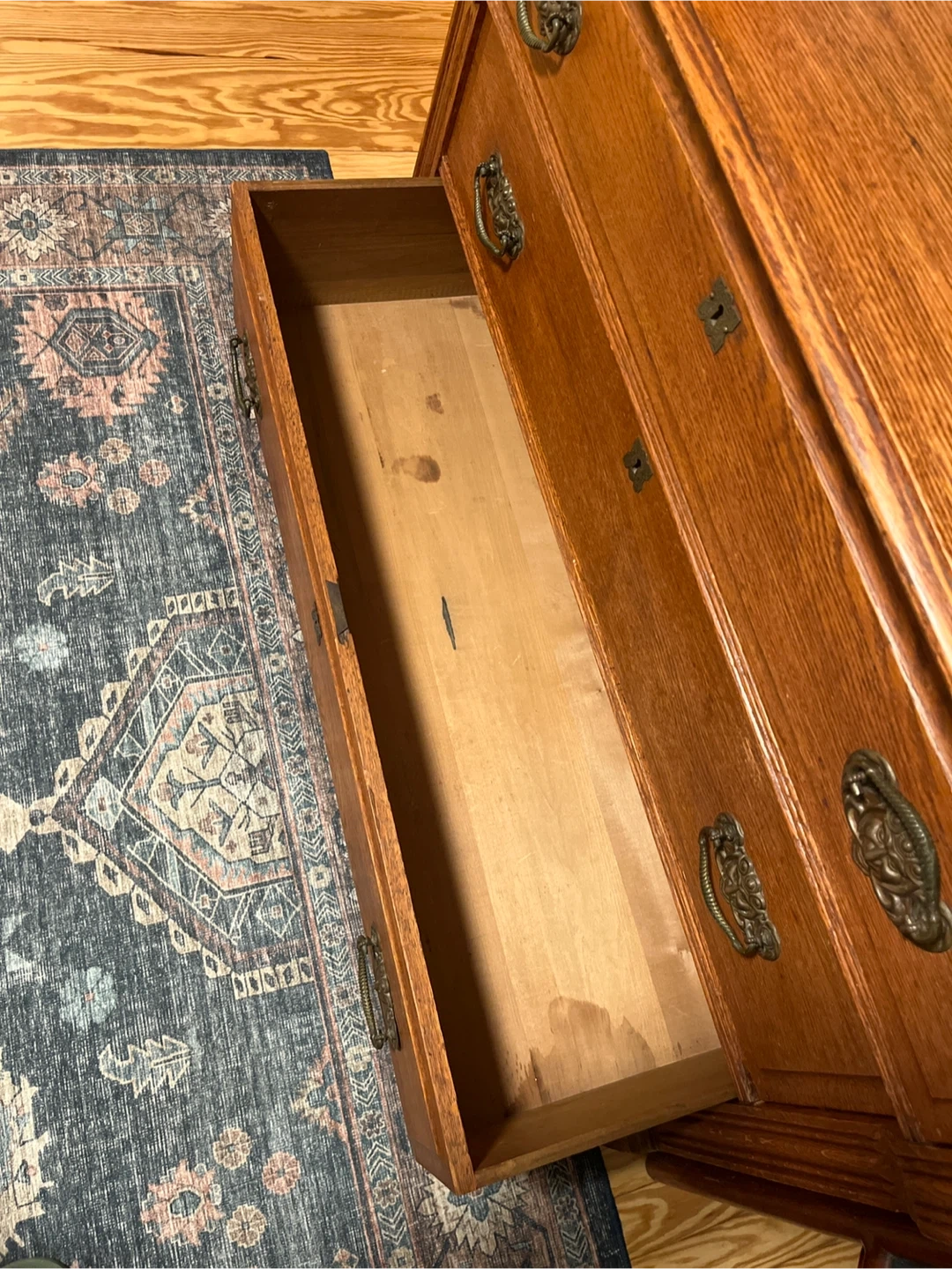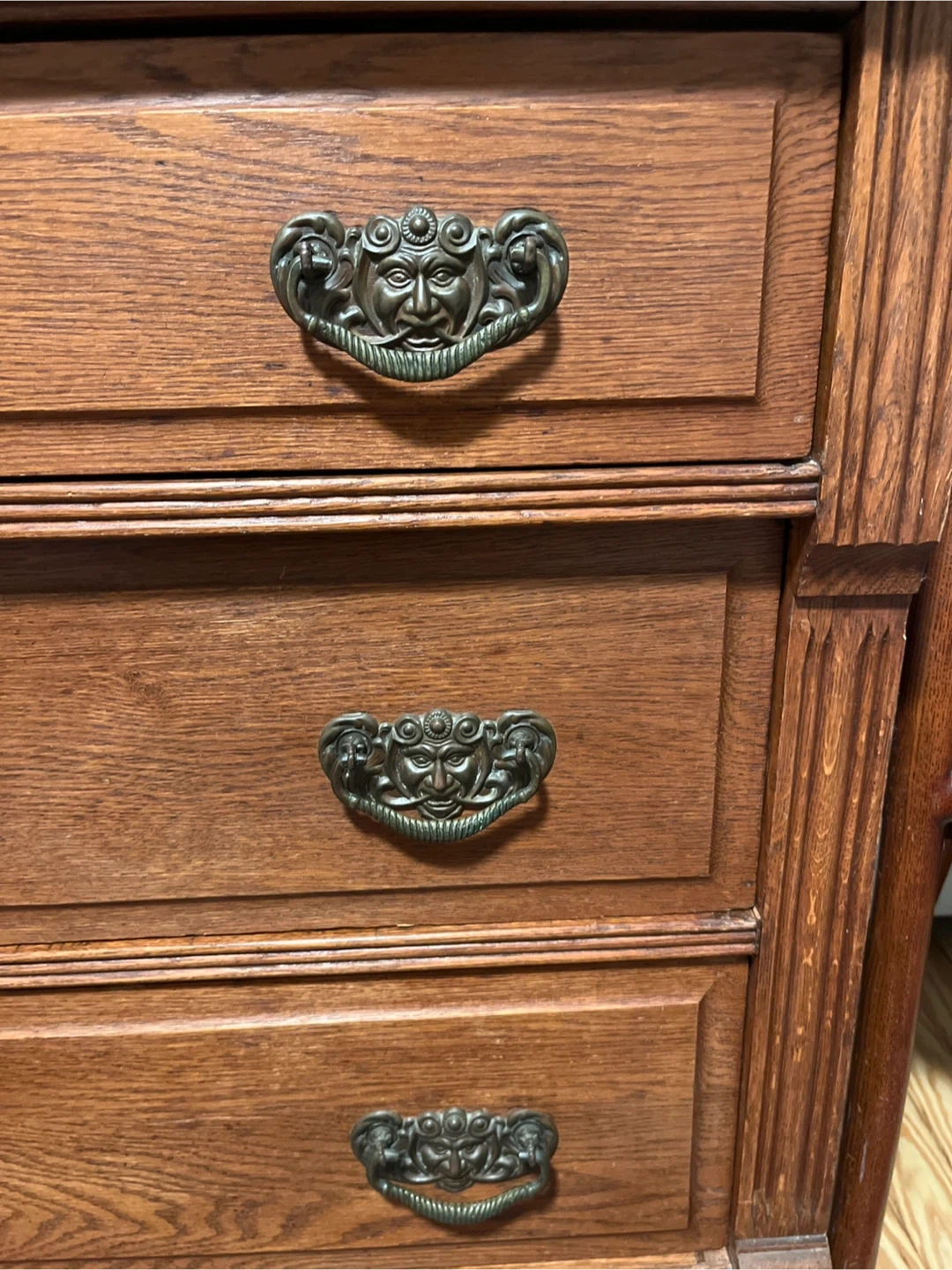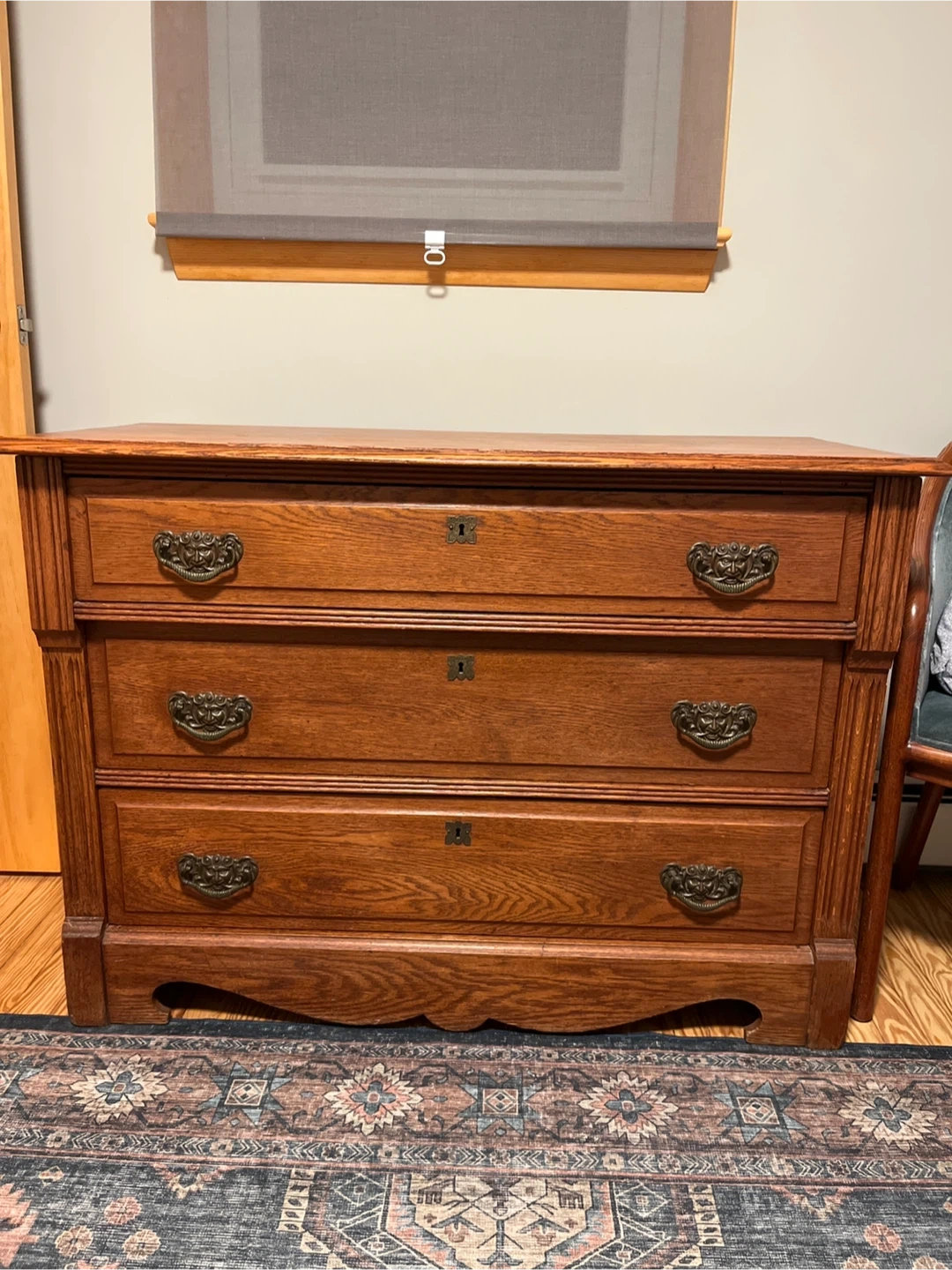 This is a beautiful antique chest with three drawers. It's made of solid oak wood with ornate brass pulls. The wood has a warm, rich finish. It's perfect for storage in any room! Measurements: 43 1/8” width, 17 7/8 depth, 30 7/8 height