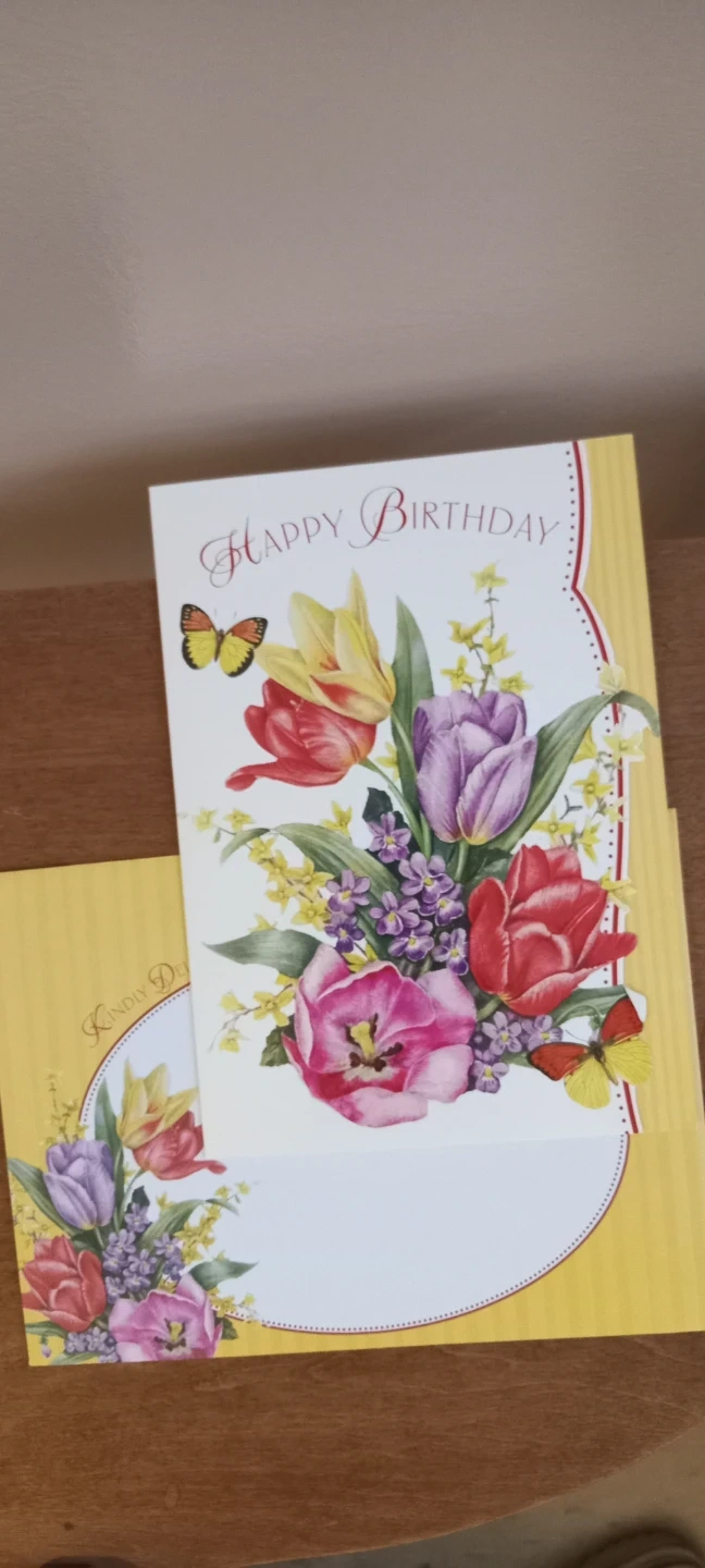 A lovely birthday card featuring a colourful floral arrangement with tulips and butterflies. The inside of the card has a sweet message for the recipient's special day. Spending this whole day thinking happy thoughts of you...