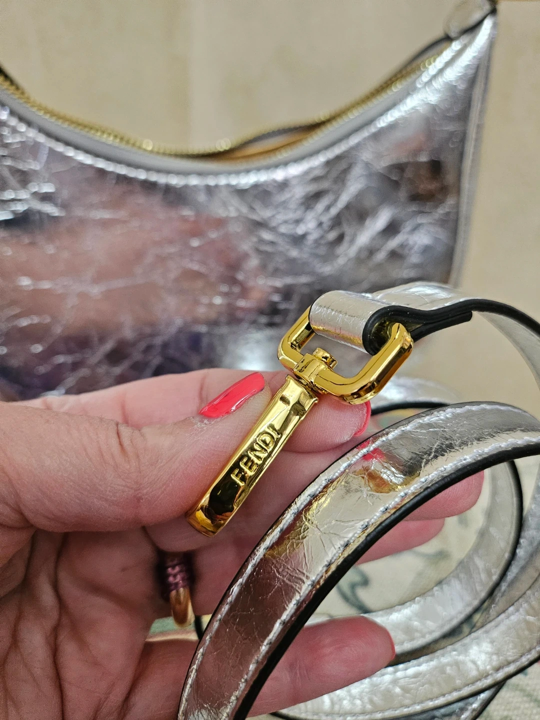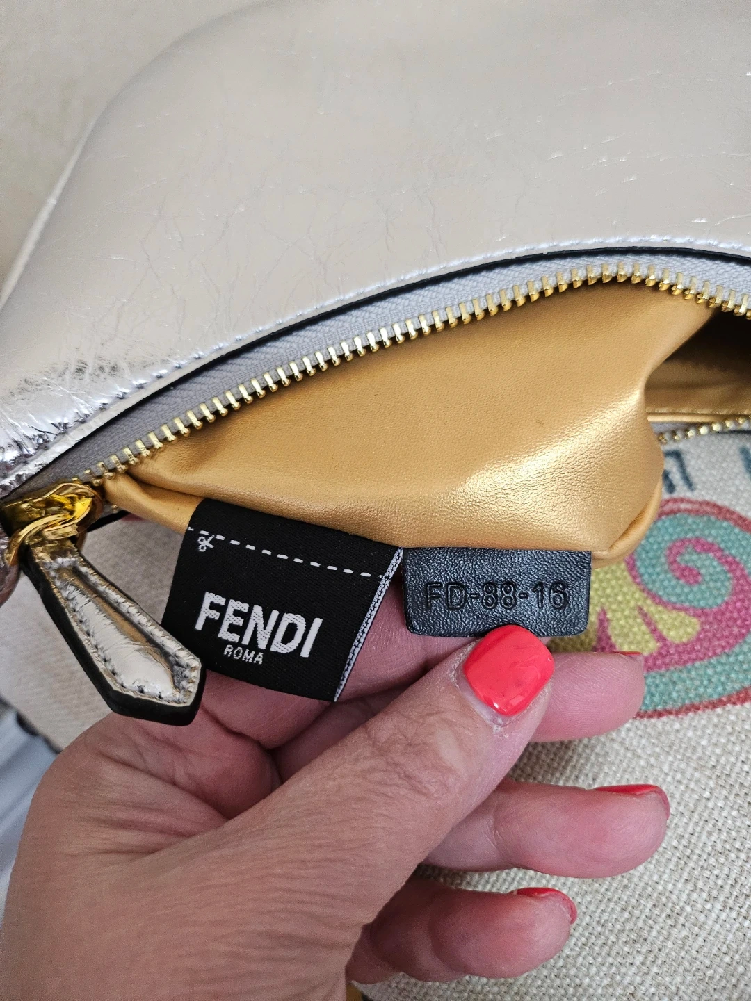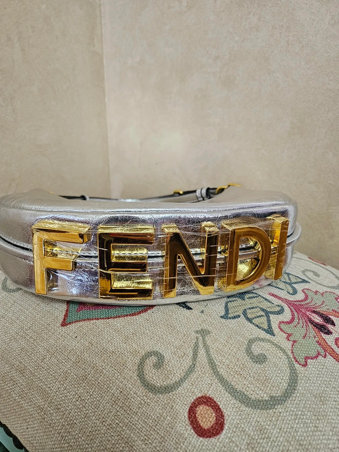 Elevate your style with this stunning Fendi purse. Featuring a sleek silver design with bold gold accents, it's perfect for adding a touch of luxury to any outfit. Brand new, never used, authentic with included strap belt, the gold Fendi mark is still wrapped in the original plastic ๐. Made in italy ๐ฎ๐น.