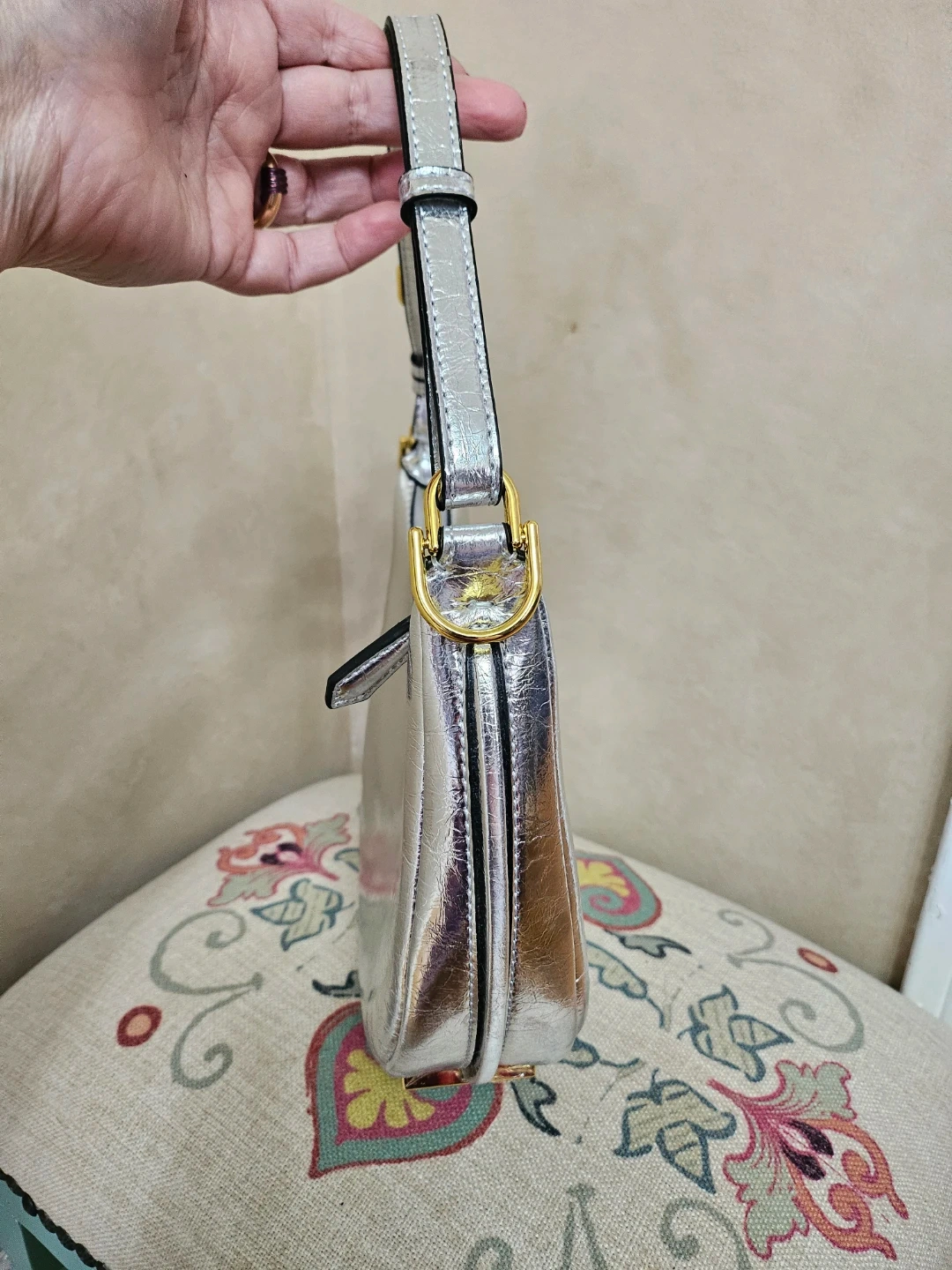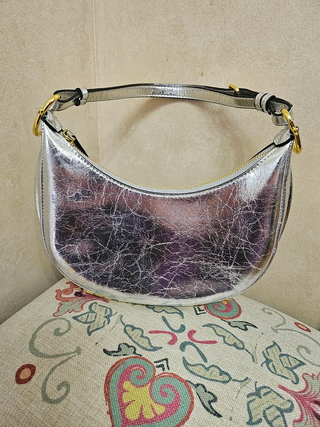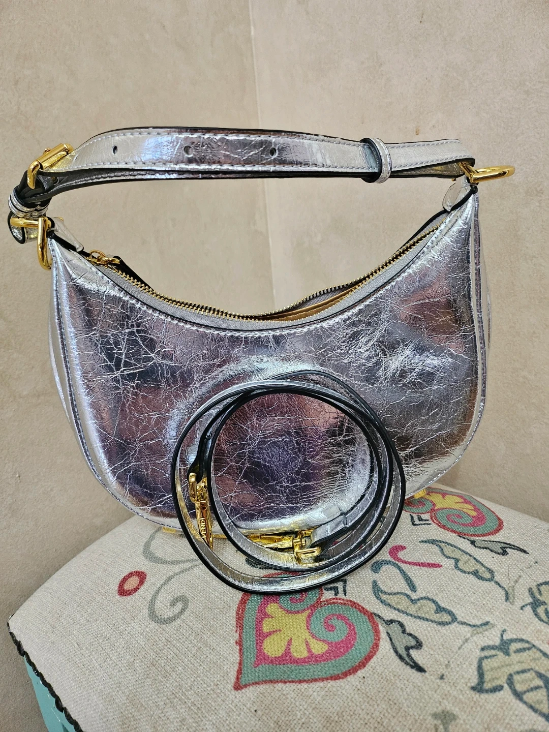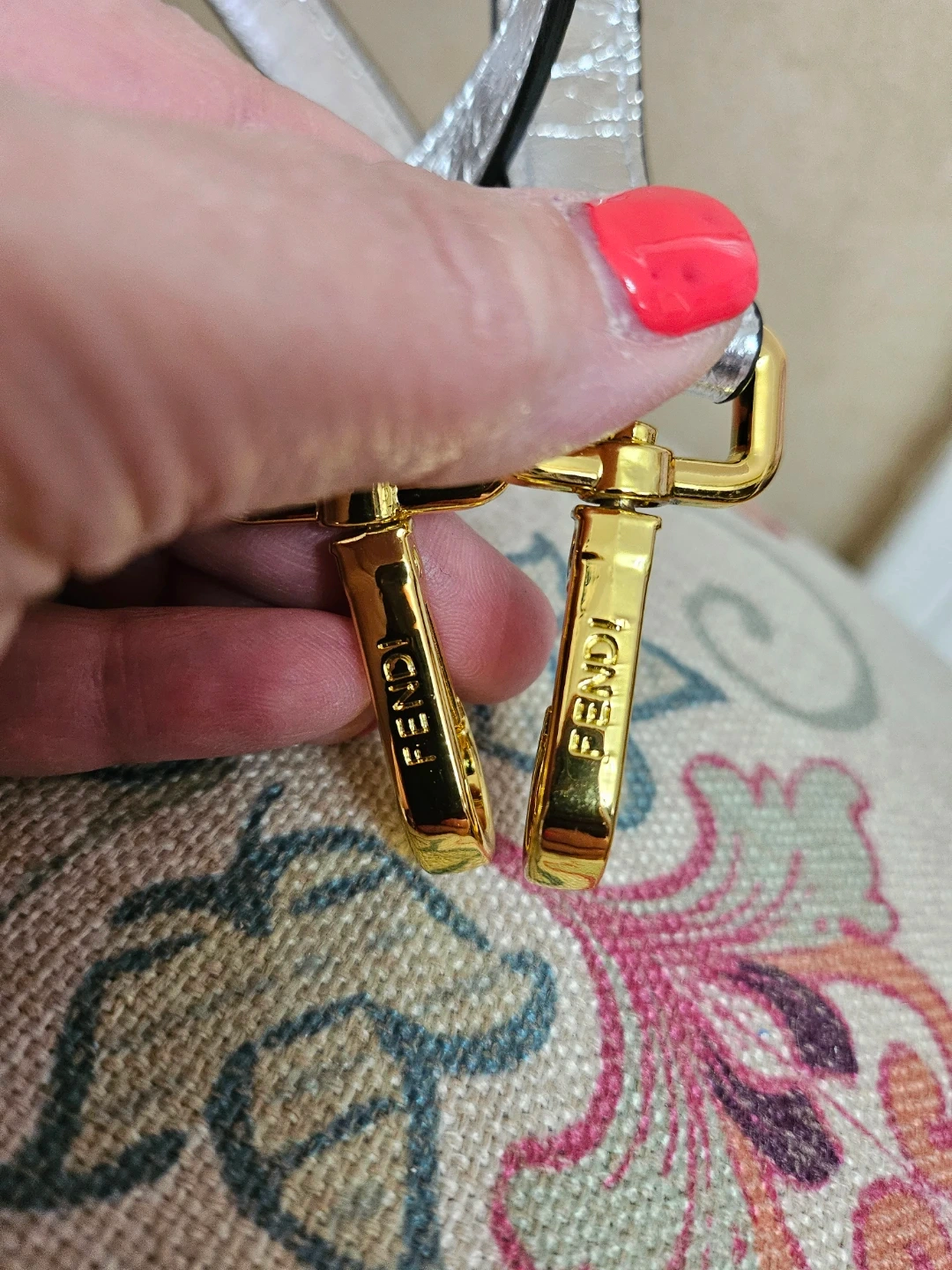 Elevate your style with this stunning Fendi purse. Featuring a sleek silver design with bold gold accents, it's perfect for adding a touch of luxury to any outfit. Brand new, never used, authentic with included strap belt, the gold Fendi mark is still wrapped in the original plastic ๐. Made in italy ๐ฎ๐น.