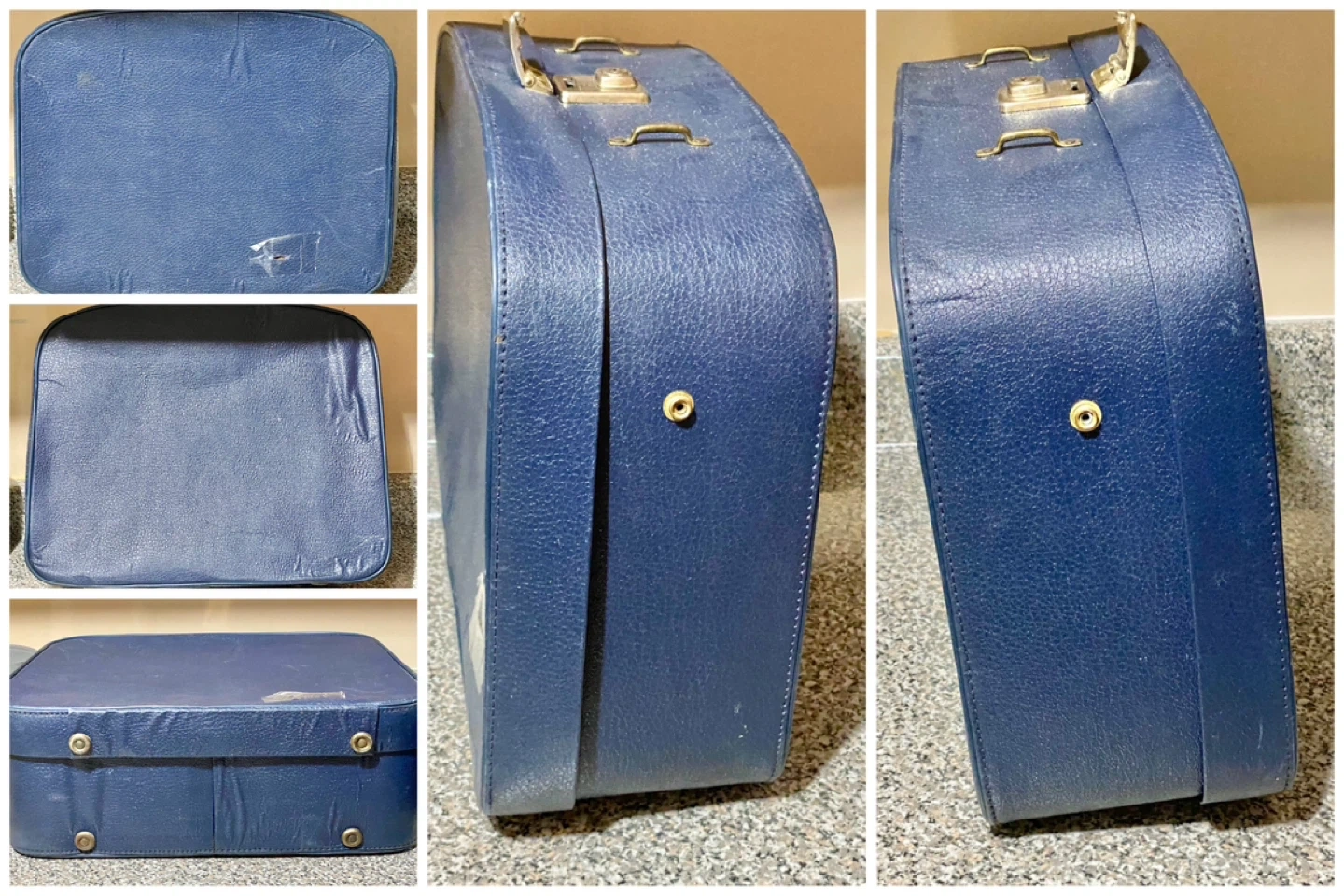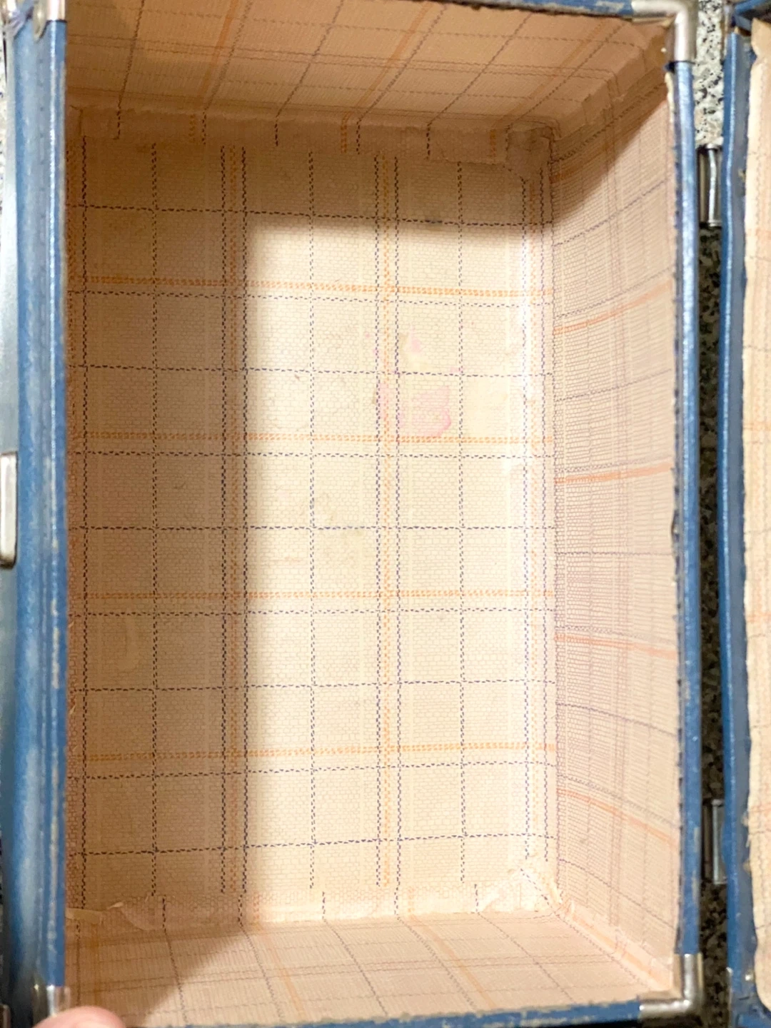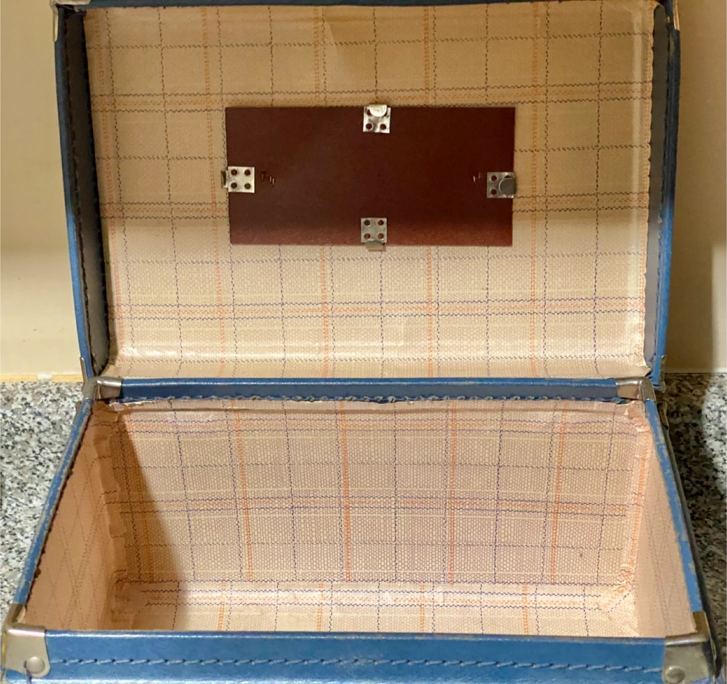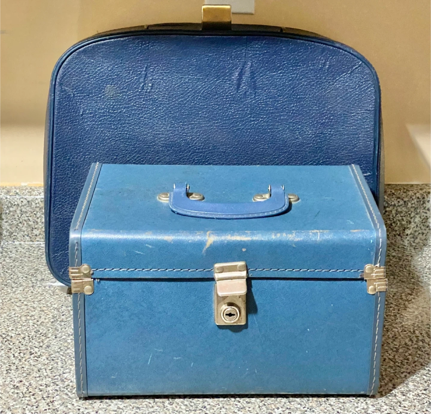 This is a vintage blue vanity case, perfect for storing makeup or travel essentials. It's made of a durable faux leather material and features gold-tone latches. The interior is lined with a plaid fabric and has a small mirror holder. Please note that both have sustained some wear and tear, and the lock mechanism does not function as intended.