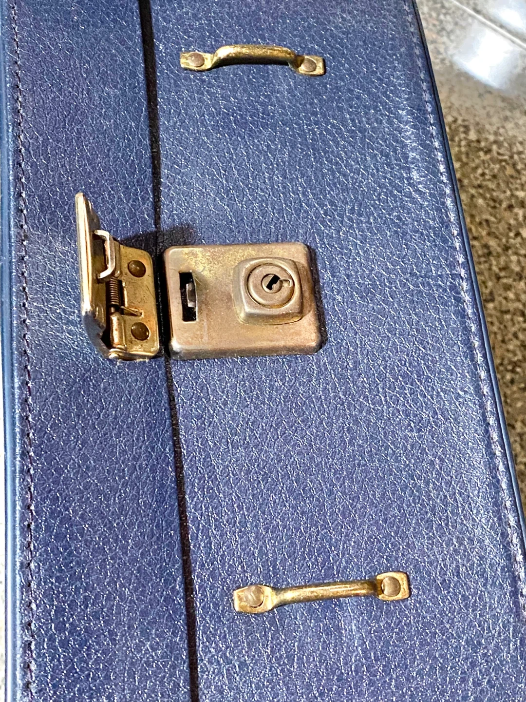 This is a vintage blue vanity case, perfect for storing makeup or travel essentials. It's made of a durable faux leather material and features gold-tone latches. The interior is lined with a plaid fabric and has a small mirror holder. Please note that both have sustained some wear and tear, and the lock mechanism does not function as intended.