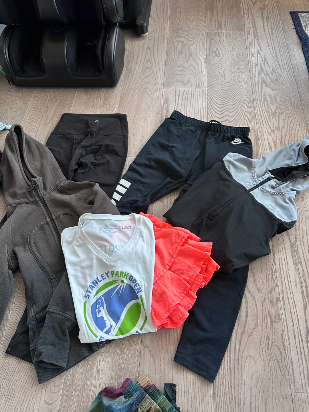 Selling a Lululemon hoodie,pants and a pair of Nike track pants, adidas hoodie, tennis skirt and athletic tops. All items are in great condition and ready for a new home
