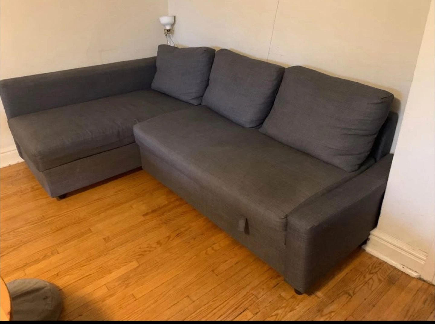 Selling this grey Ikea Friheten sofa futon. Very comfortable, it's used but has been maintained in very good condition. It also has a good amount of storage that can be used for blankets, pillows, etc.Few scratches here and there.