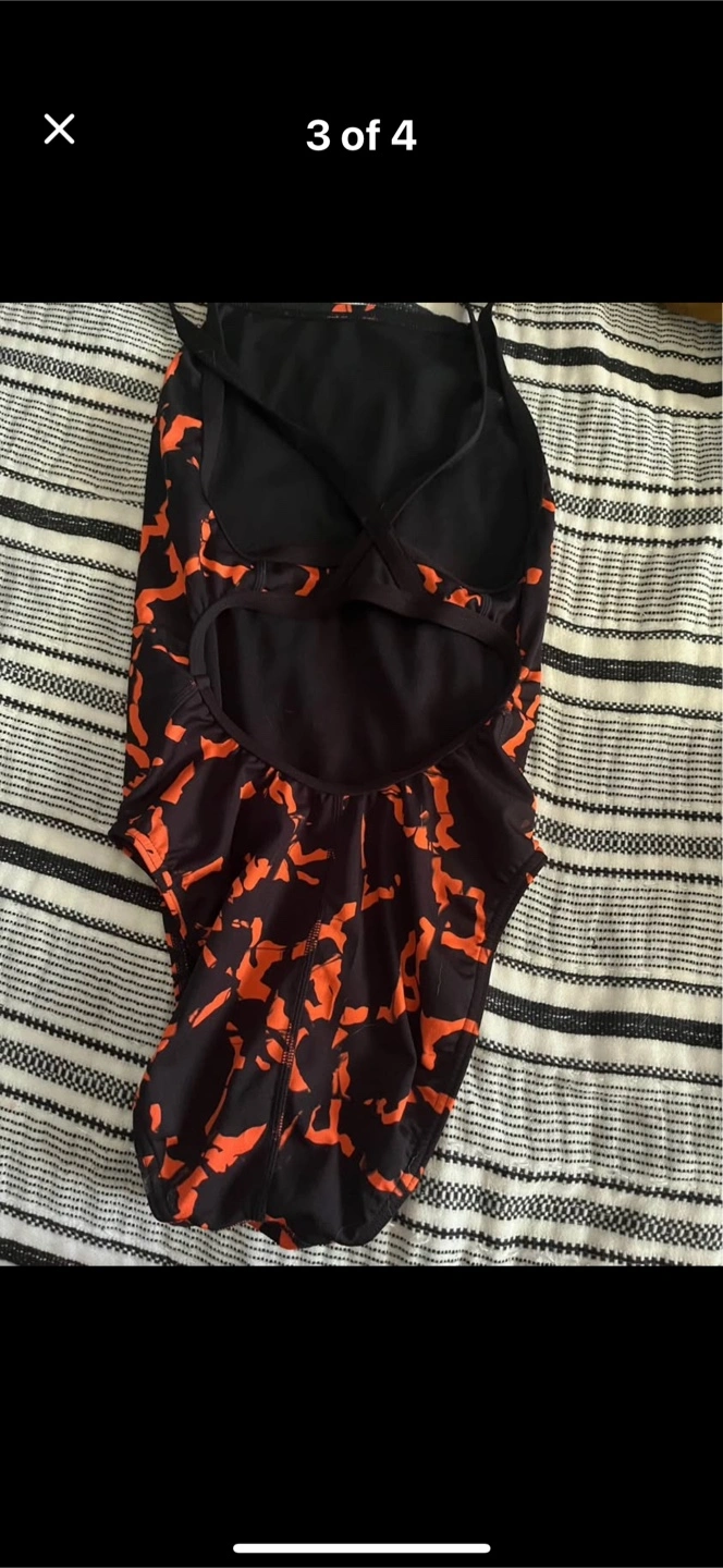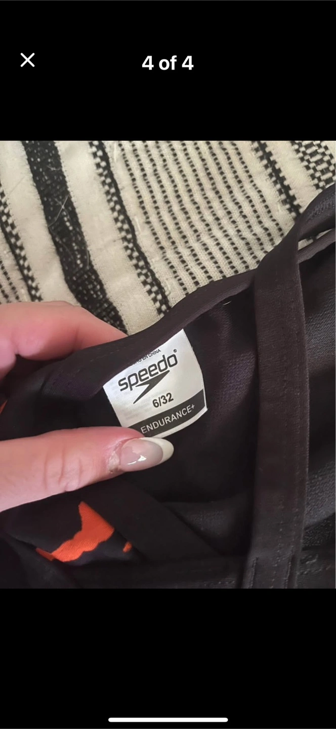 Selling a Speedo Endurance+ swimsuit in size 6. It features a black and orange pattern. Great for swimming laps or just having fun in the water!