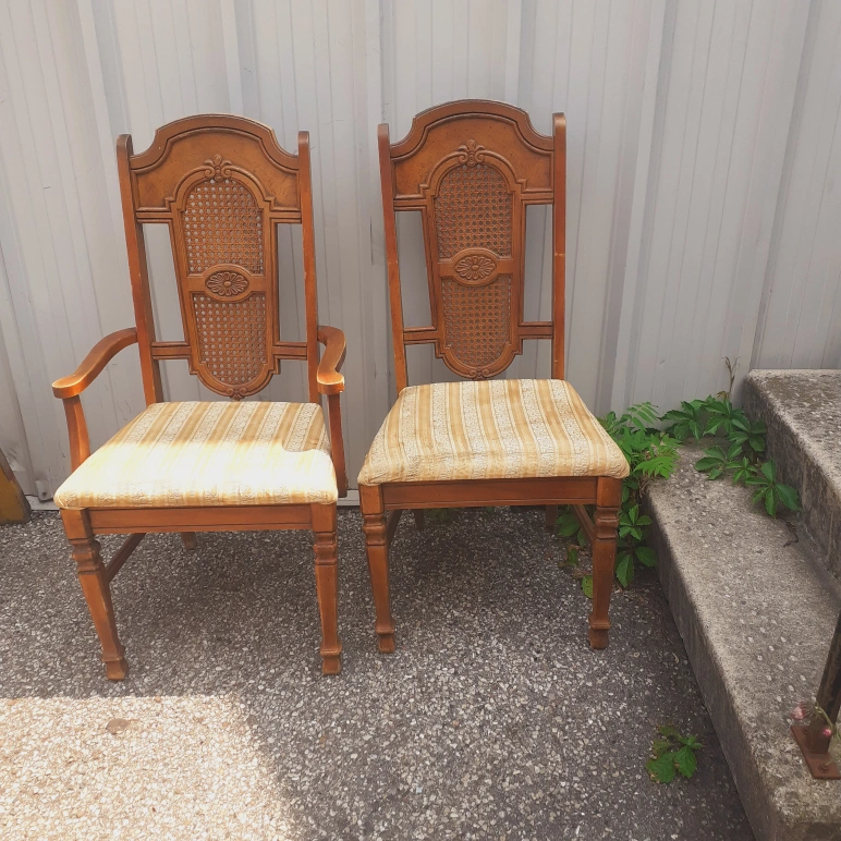 Selling a charming set of two vintage-style dining chairs. One chair has armrests, while the other is armless. They both feature a lovely woven cane back and striped upholstered seats. Perfect for adding a touch of classic elegance to your dining space!