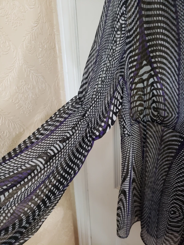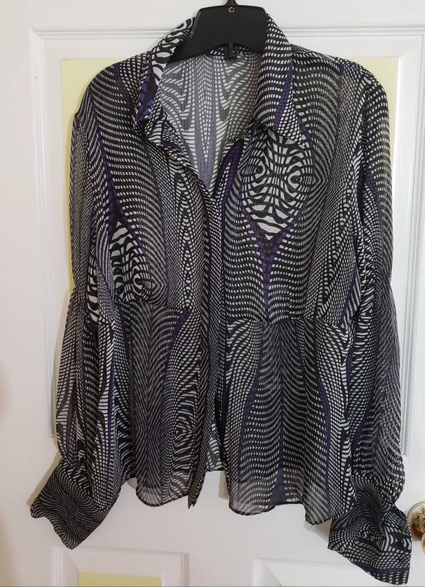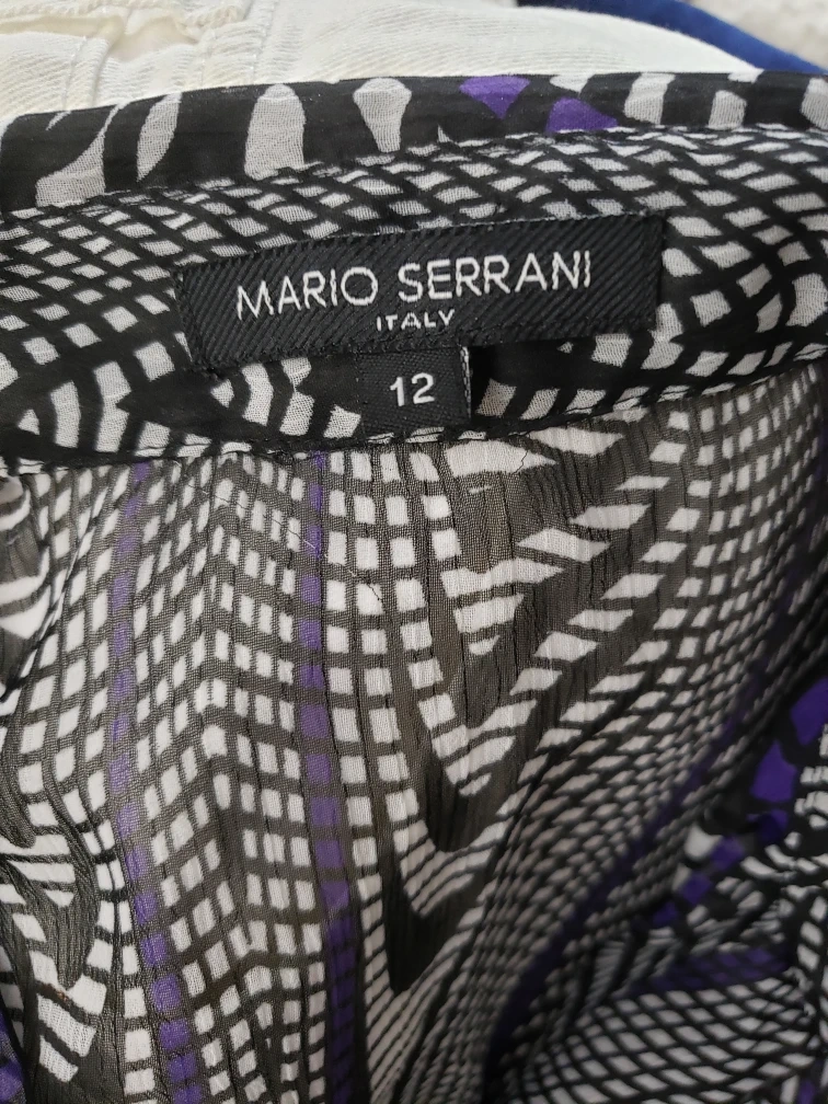 Selling a Mario Serrani blouse in size 12. The blouse features a unique patterned design with black, white, and purple accents. It's in great condition and ready for a new home!
