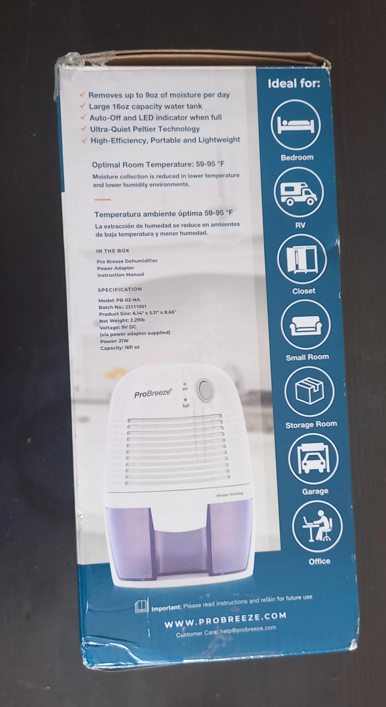 Selling a ProBreeze Mini Dehumidifier, still in its original box! It's perfect for small spaces like bedrooms, closets, or offices.