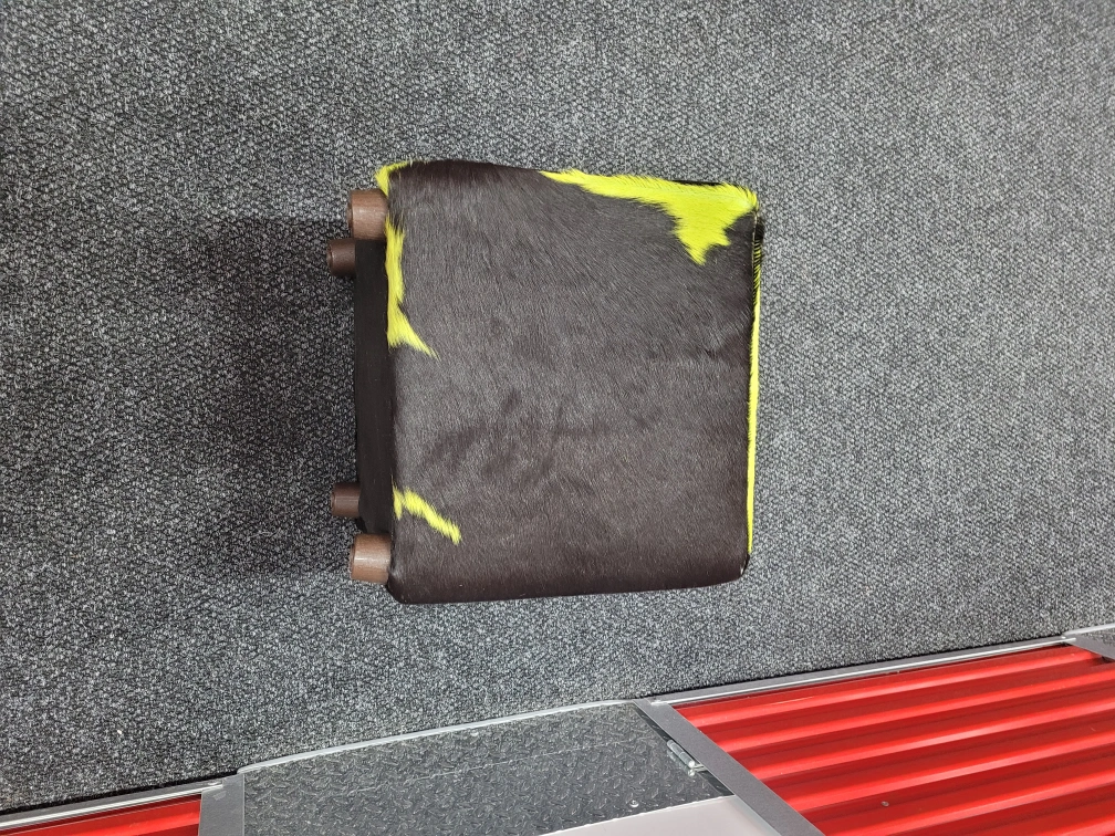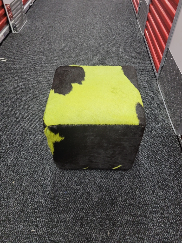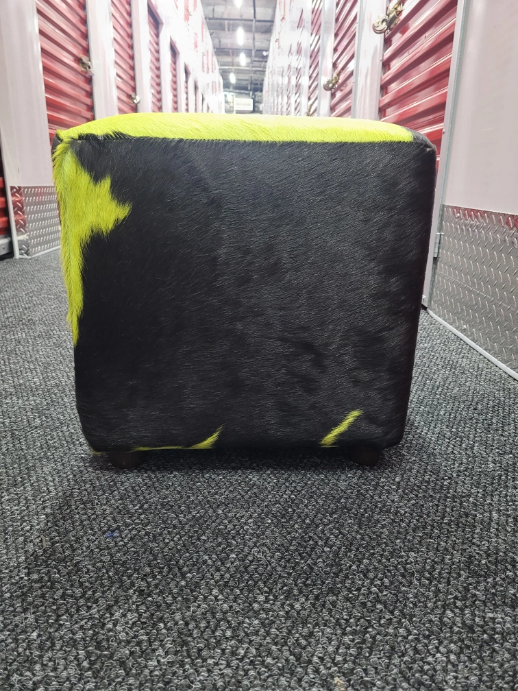 Selling a unique cowhide ottoman featuring a striking green and black pattern! It's in great condition and would add a fun pop of color to any room