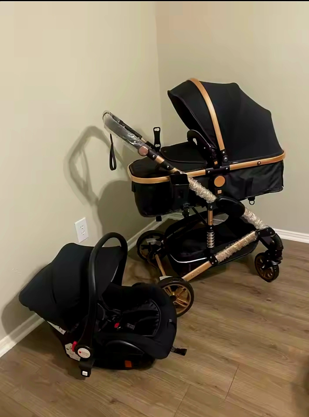 Selling a stylish 3-in-1 baby stroller set in black and gold! This set includes the stroller, bassinet, and car seat, offering versatility for your baby's needs. The stroller is in great condition and ready for a new home. Box included!