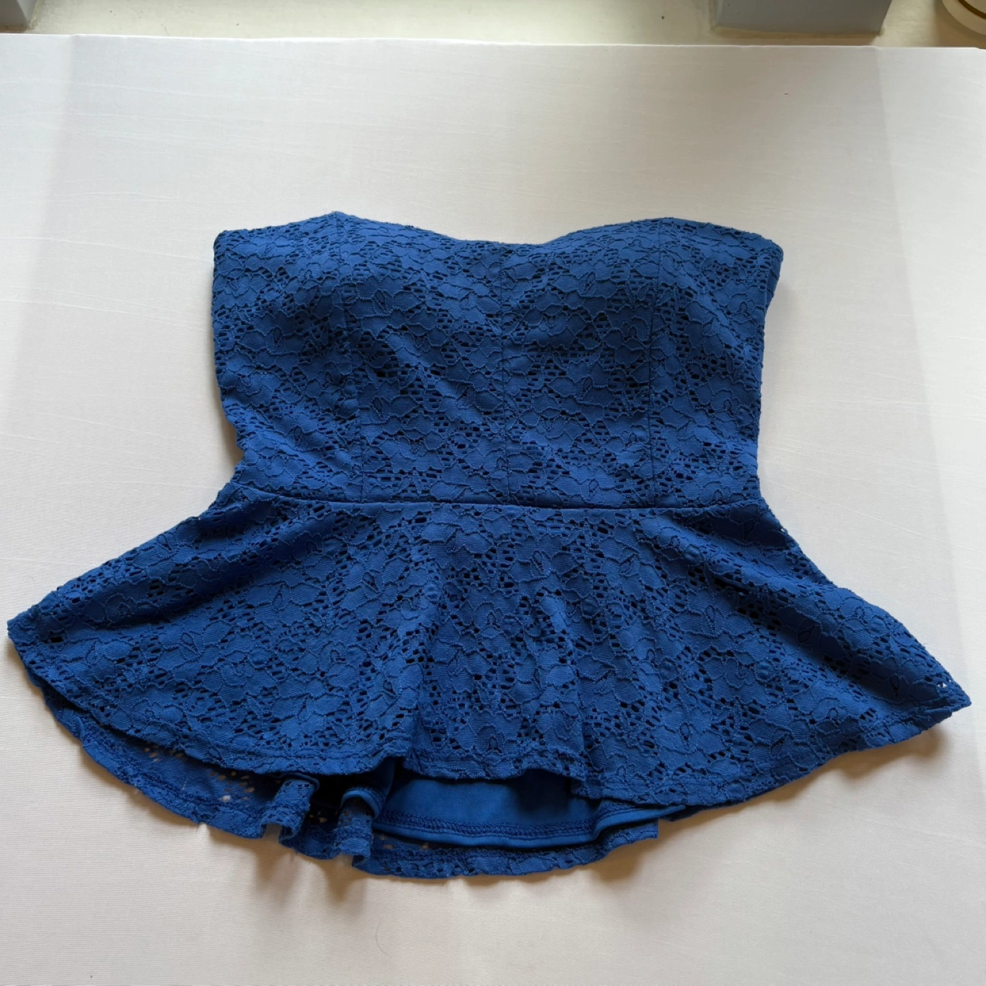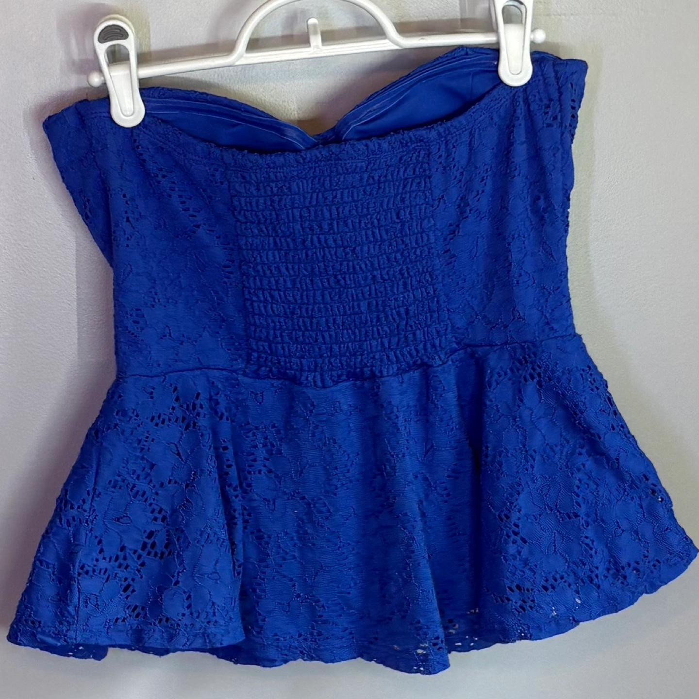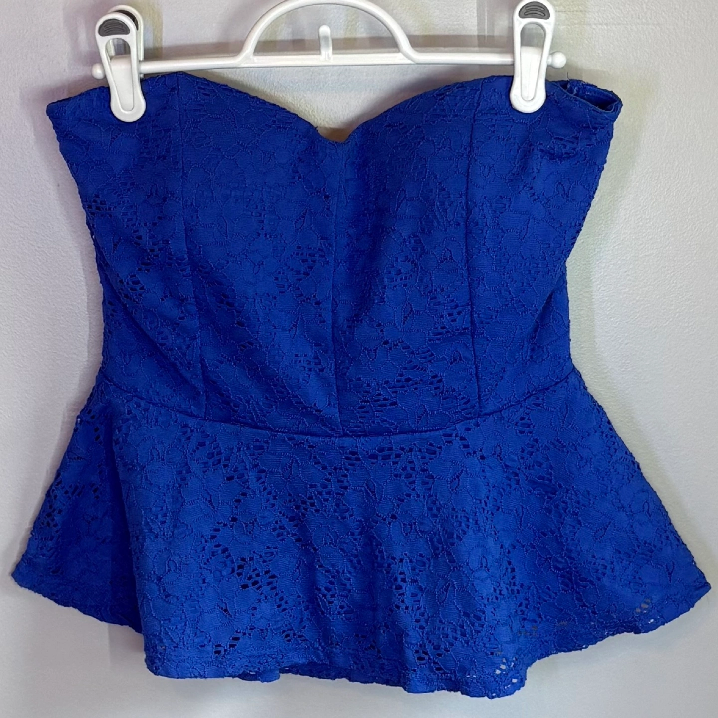 Ambiance royal blue lace peplum strapless top with a sweetheart neckline, perfect for a night out! This top is a size large and has a beautiful lace overlay with a peplum design that accentuates the waist. Padded so it can be worn with or without a bra and features a silicone anti-slip band at the top. It's in good condition, ready to add a pop of colour to your wardrobe.