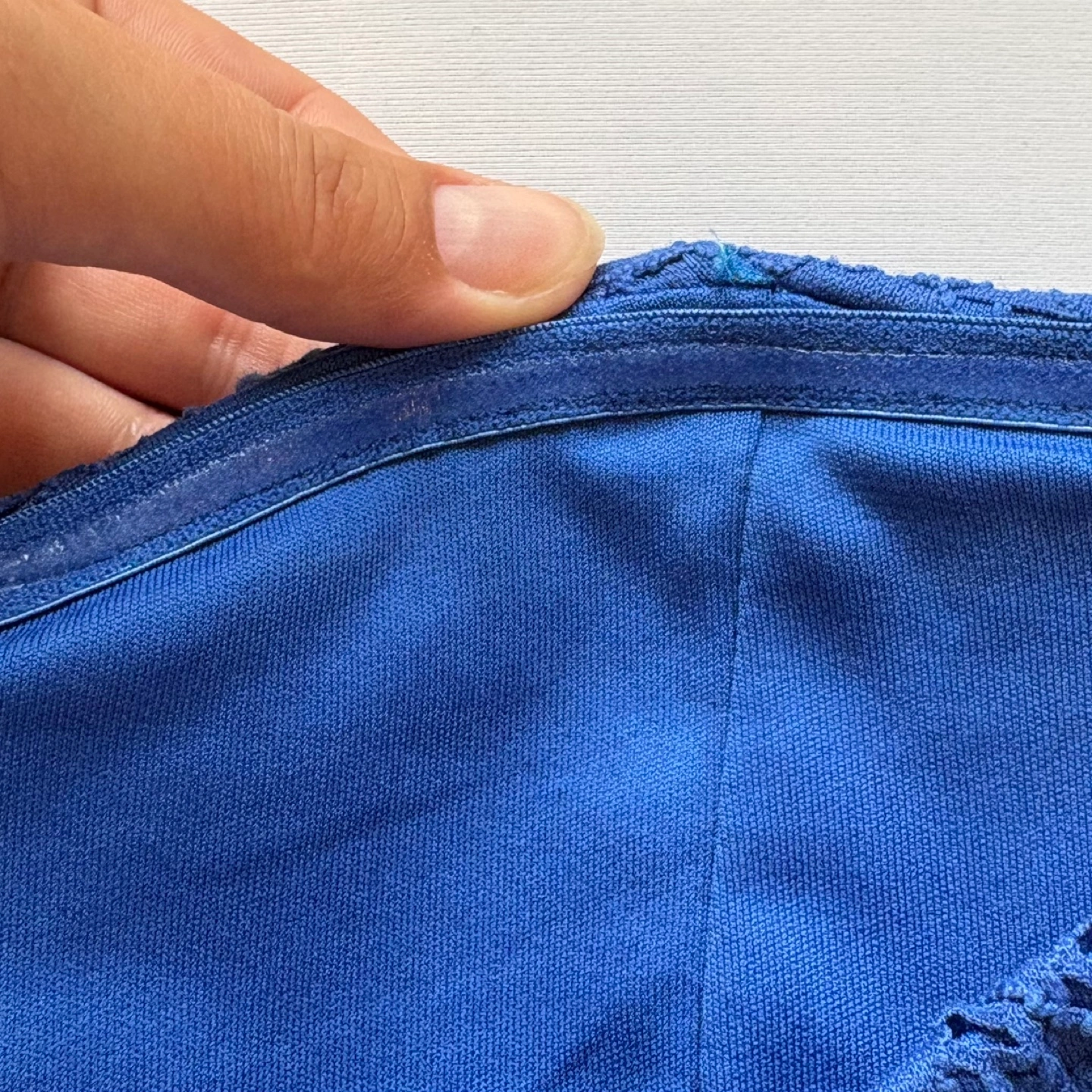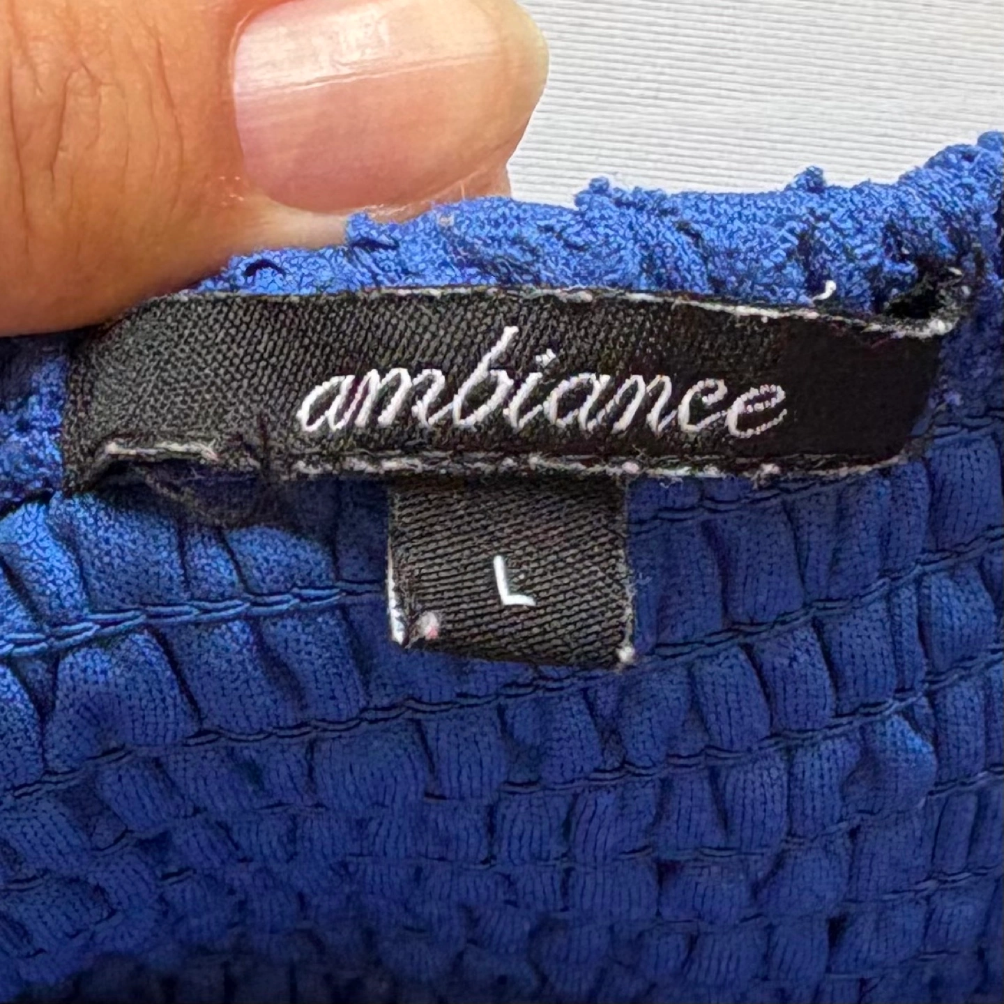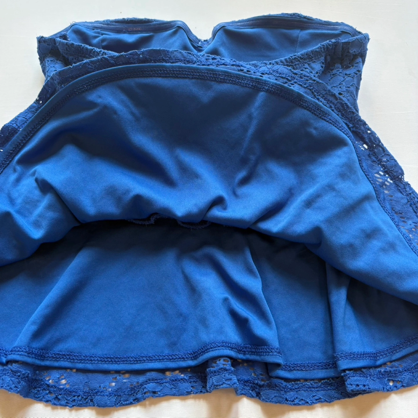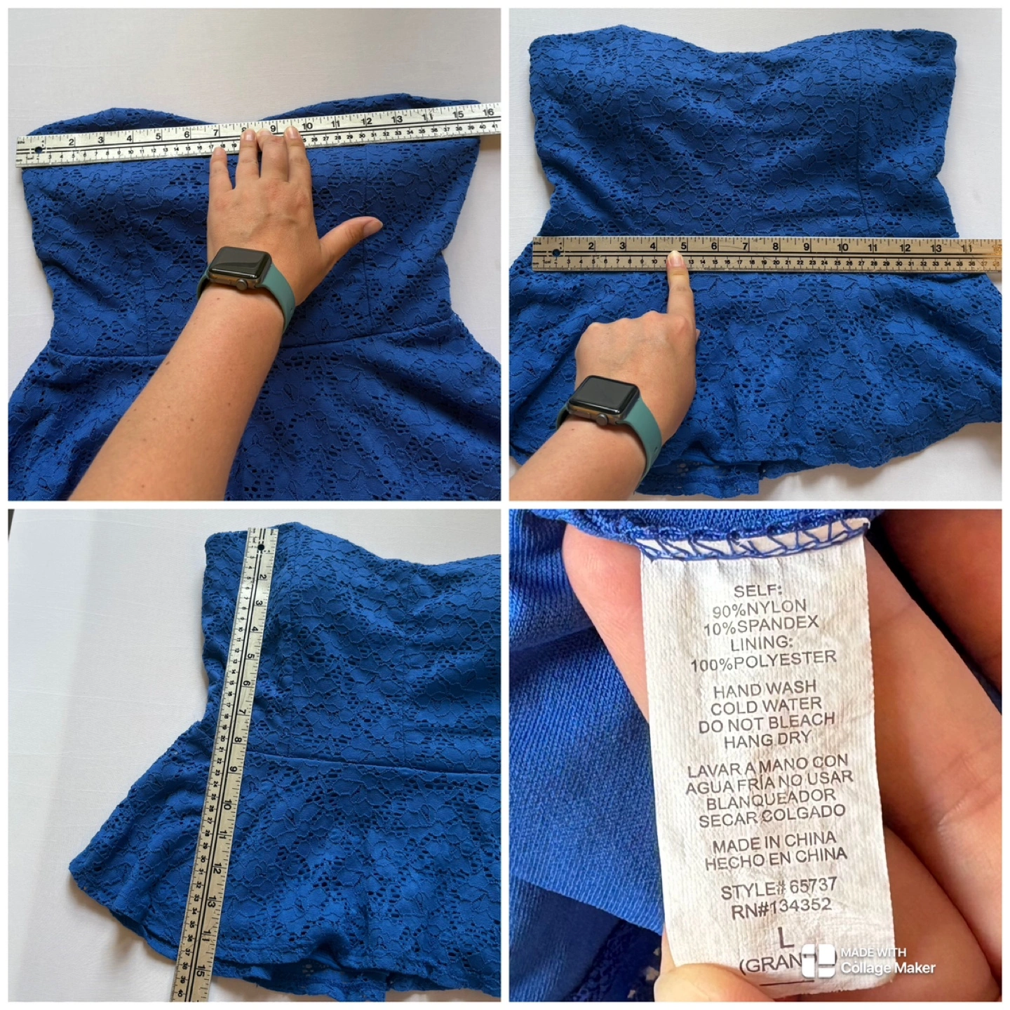 Ambiance royal blue lace peplum strapless top with a sweetheart neckline, perfect for a night out! This top is a size large and has a beautiful lace overlay with a peplum design that accentuates the waist. Padded so it can be worn with or without a bra and features a silicone anti-slip band at the top. It's in good condition, ready to add a pop of colour to your wardrobe.