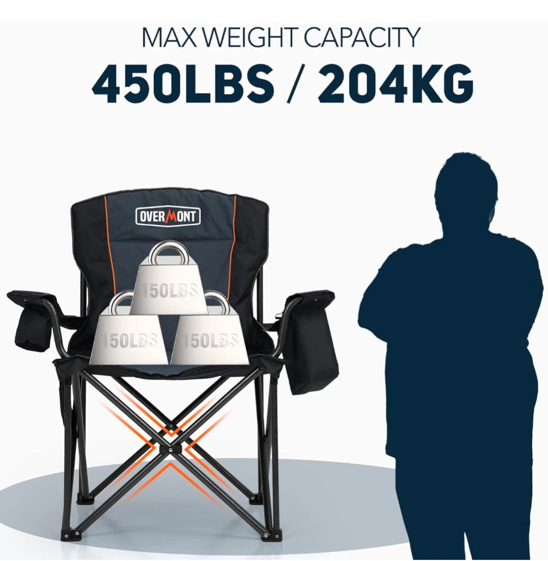 This Overmont chair is designed for comfort and convenience! It features a built-in 6-can cooler to keep your drinks cold on the go. The chair is tailored for larger builds or comfort preferences and has a max weight capacity of 450lbs / 204kg. It also has thoughtful details like a back storage pocket, convenient side pocket, and non-slip, wear-resistant ABS plastic feet. The chair is 39.4" tall, 22.8" wide, and 24.7" deep when open, and 41" tall and 7" wide when packed in its carrying bag