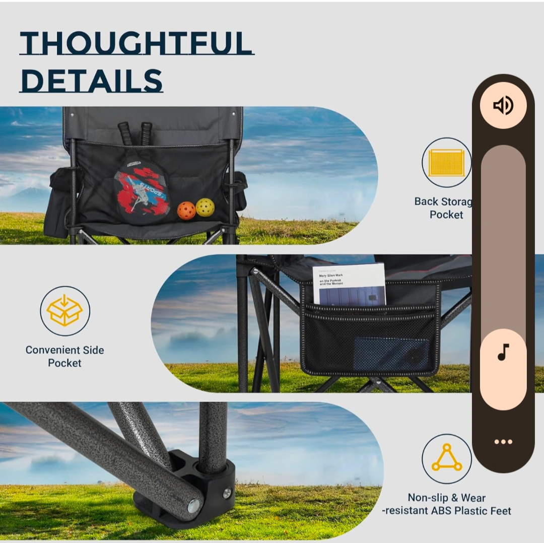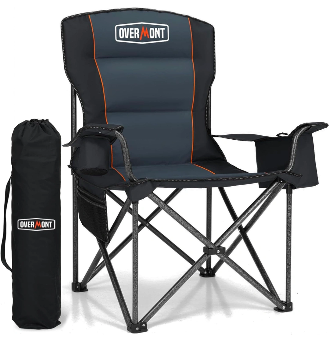 This Overmont chair is designed for comfort and convenience! It features a built-in 6-can cooler to keep your drinks cold on the go. The chair is tailored for larger builds or comfort preferences and has a max weight capacity of 450lbs / 204kg. It also has thoughtful details like a back storage pocket, convenient side pocket, and non-slip, wear-resistant ABS plastic feet. The chair is 39.4" tall, 22.8" wide, and 24.7" deep when open, and 41" tall and 7" wide when packed in its carrying bag