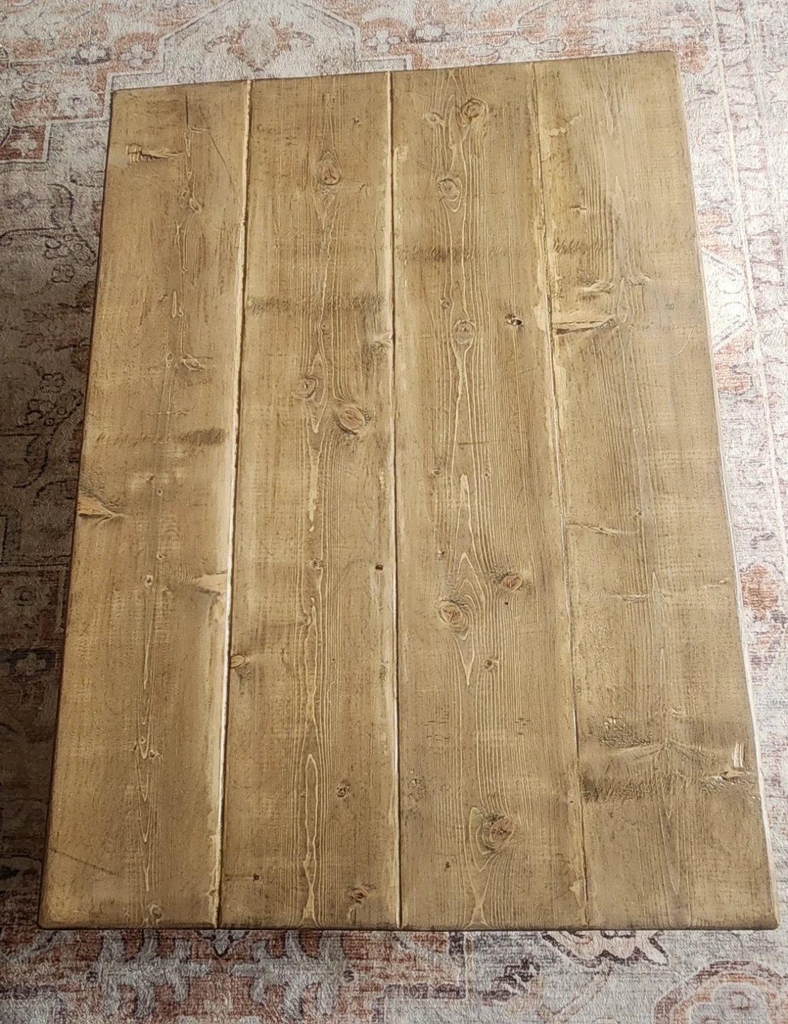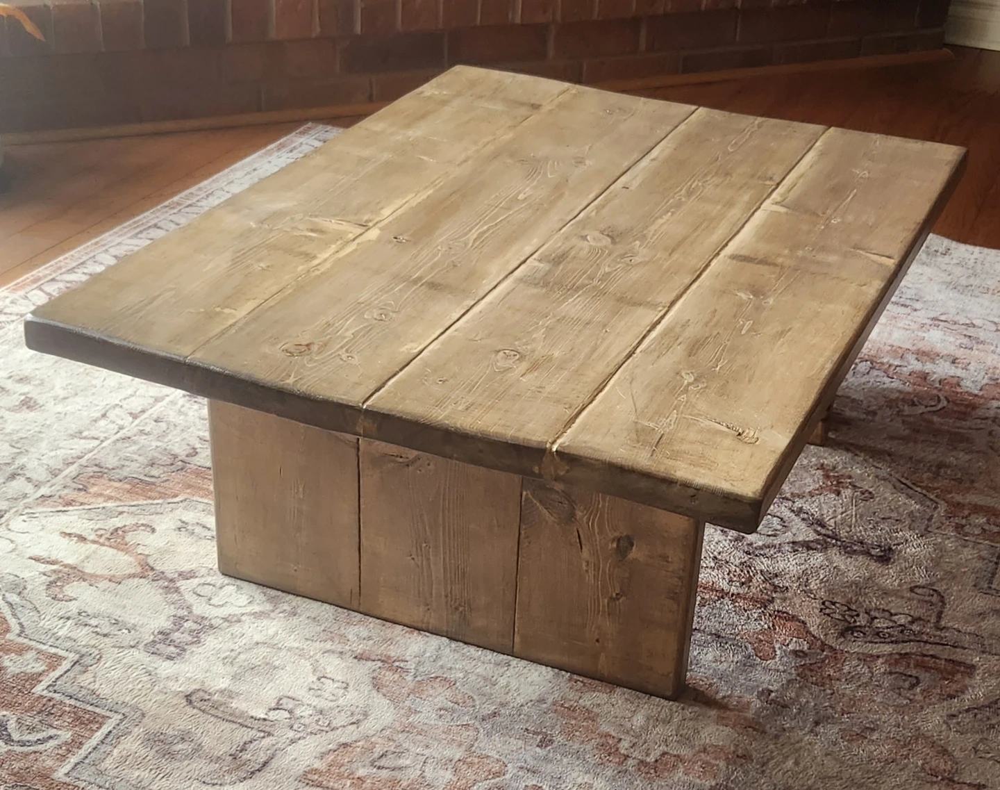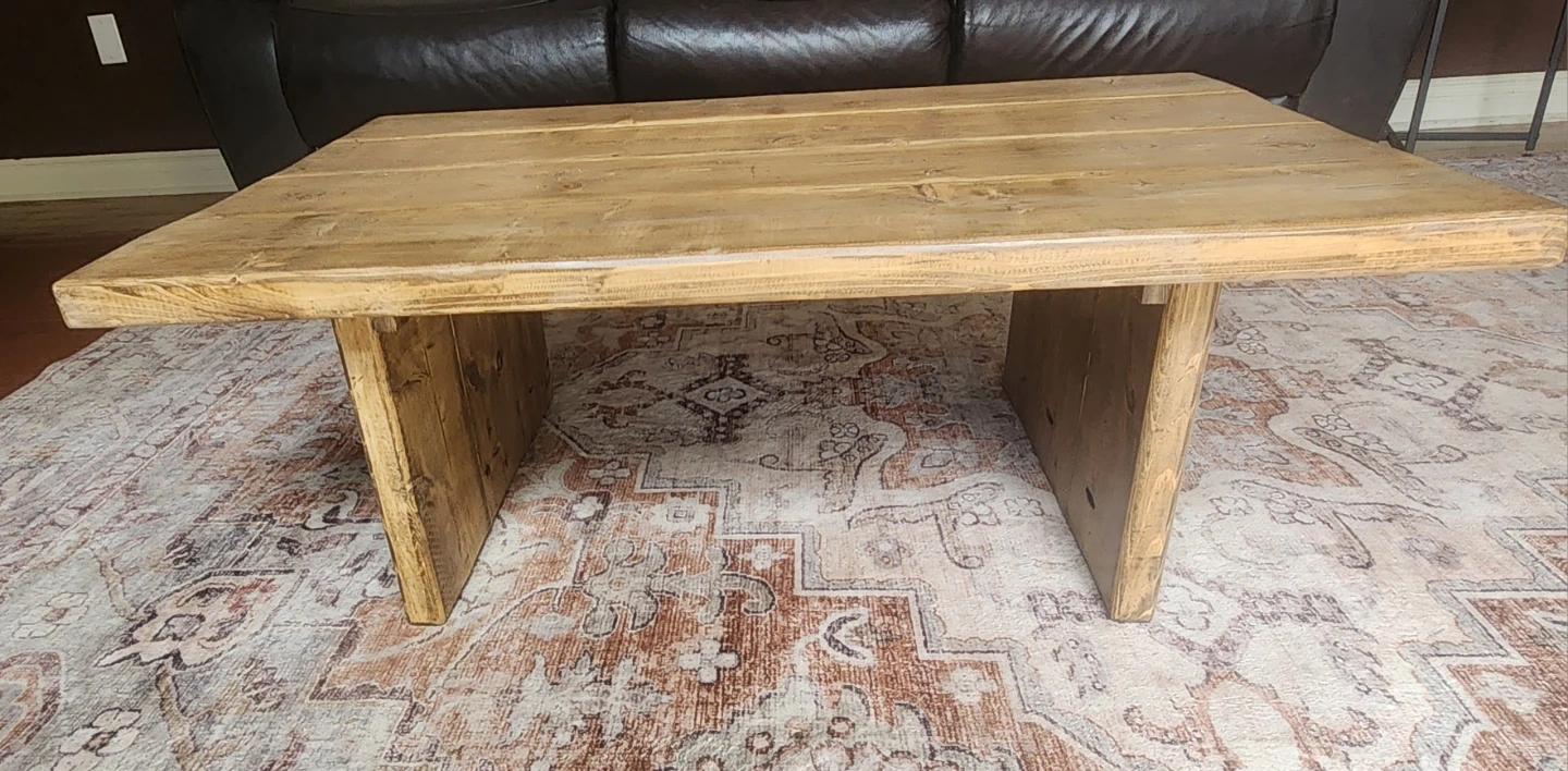 A rustic coffee table with a natural wood finish. It's made of solid wood planks. This table would be a great centrepiece for a living room!