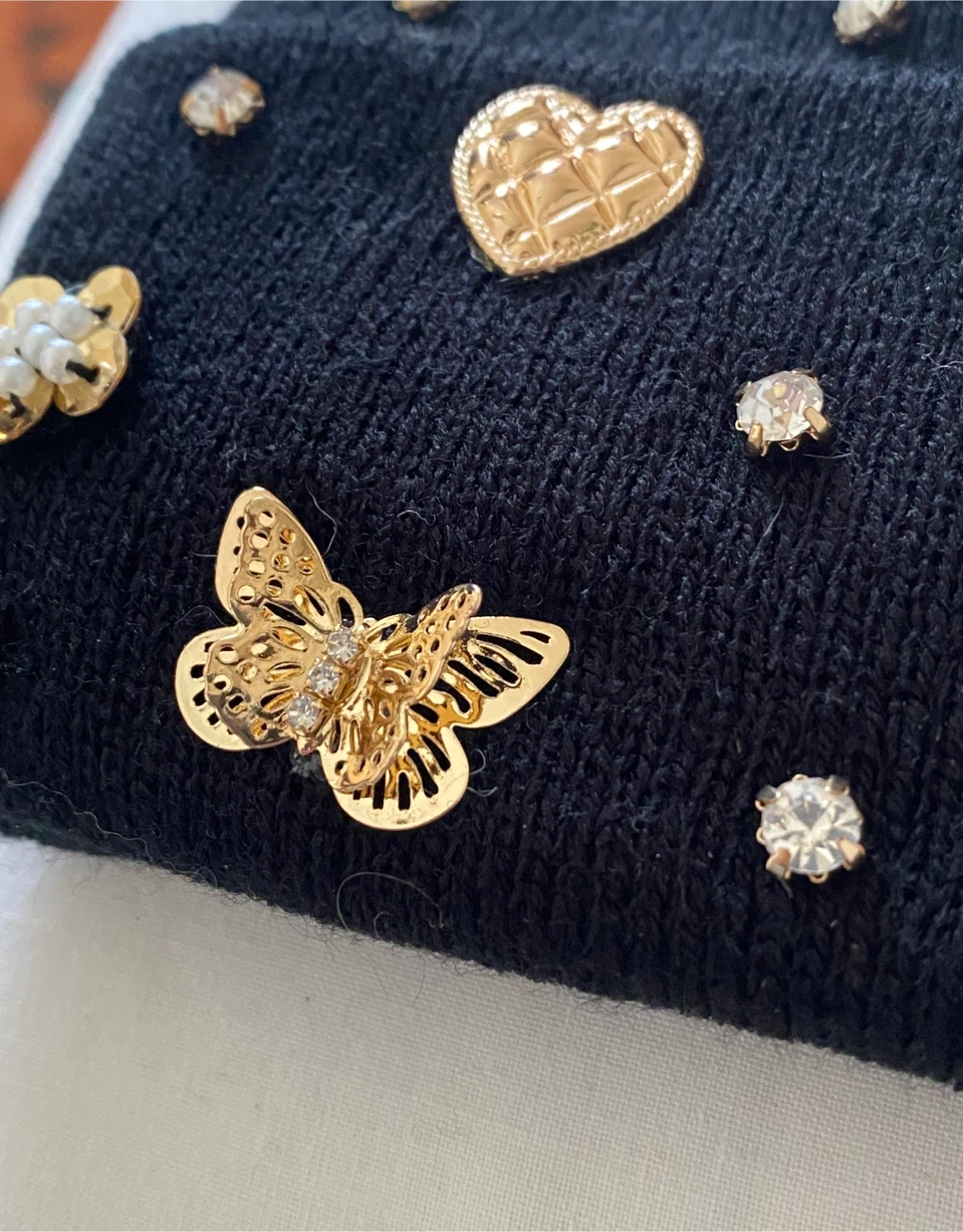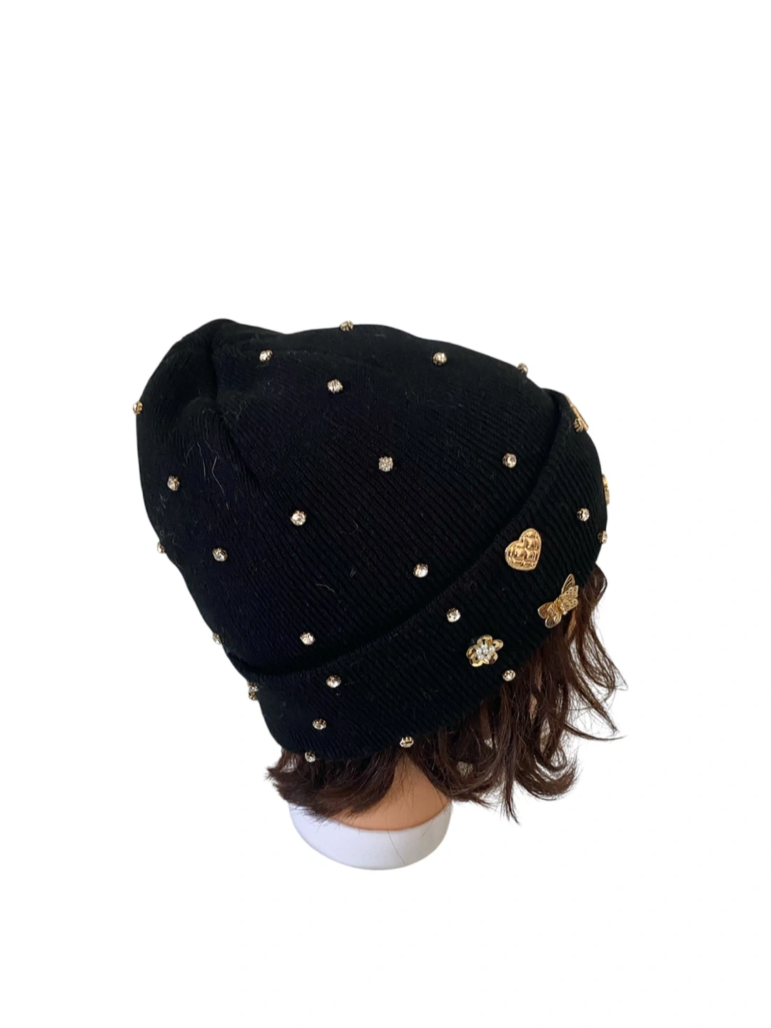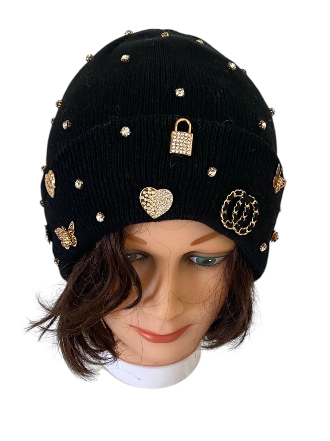 This black knitted beanie is adorned with sparkling rhinestones and charming gold tone embellishments like butterflies, hearts, and locks. It's a cozy and stylish accessory for cooler weather. Keeps your head warm and adds a bit of flair to any outfit!