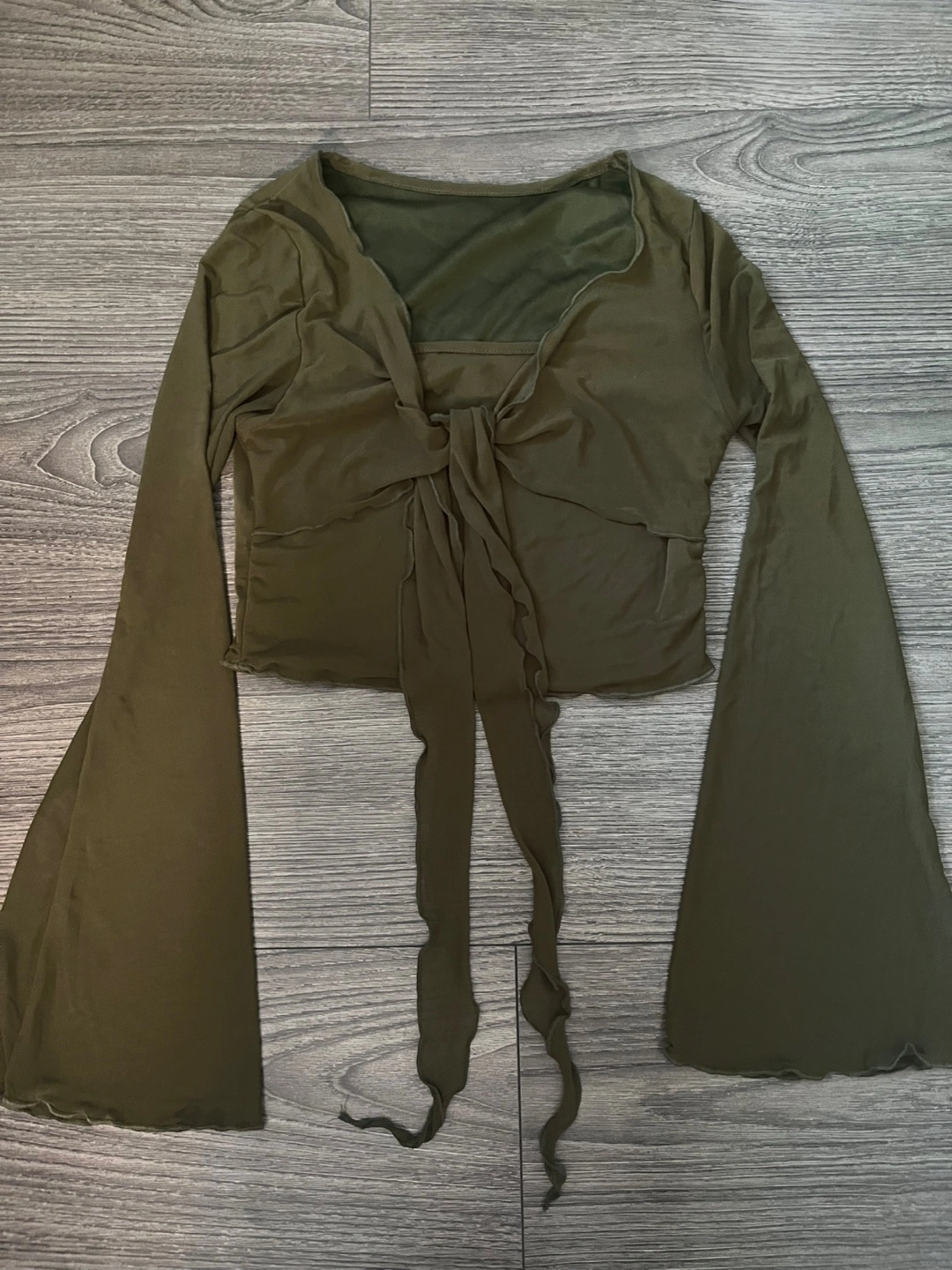 Cute olive green long sleeve top! It features a tie front and has unique bell sleeves. Size Small, perfect for adding a bit of flair to your wardrobe. - Substantial discount already applied - Can meet at any Expo Line skytrain station! Not just Edmonds.