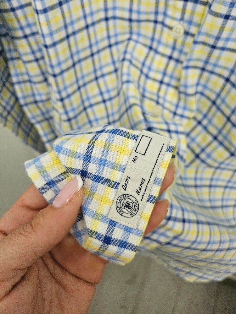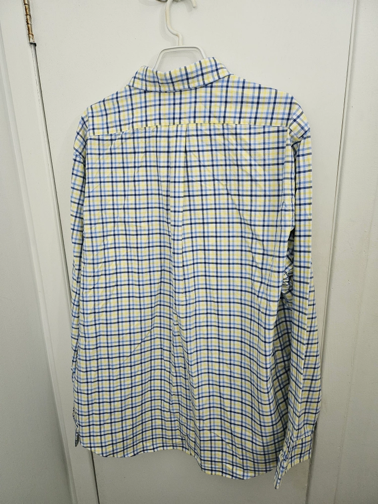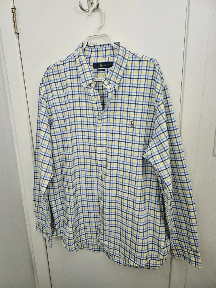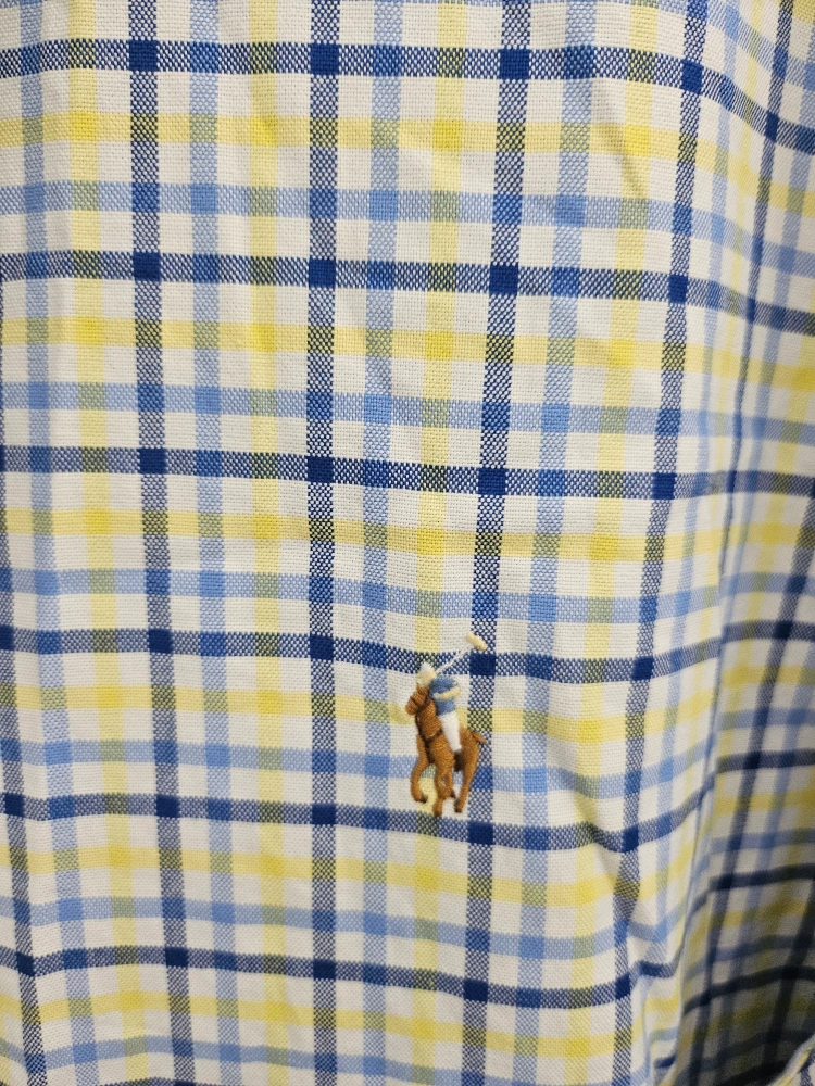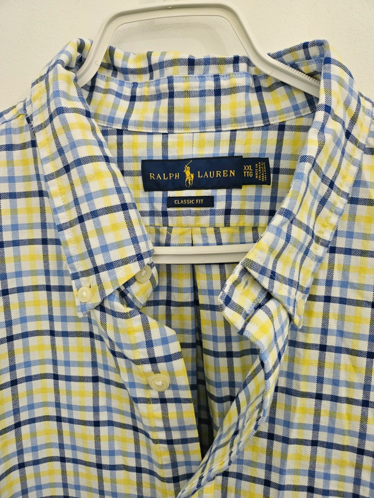 38Je vends une chemise Ralph Lauren à carreaux de taille XXL. A une coupe classique. Les couleurs sont bleu, jaune et blanc. Parfait pour un look décontracté!
